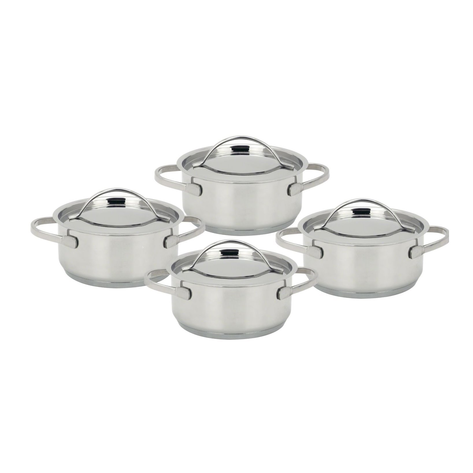 8-teiliges Mini-Topfset, Marke Demeyere , Edelstahl 18/10 Cr-Ni (Chrom-Nickel), 12 cm Durchmesser, 0,55 l Fassungsvermögen.