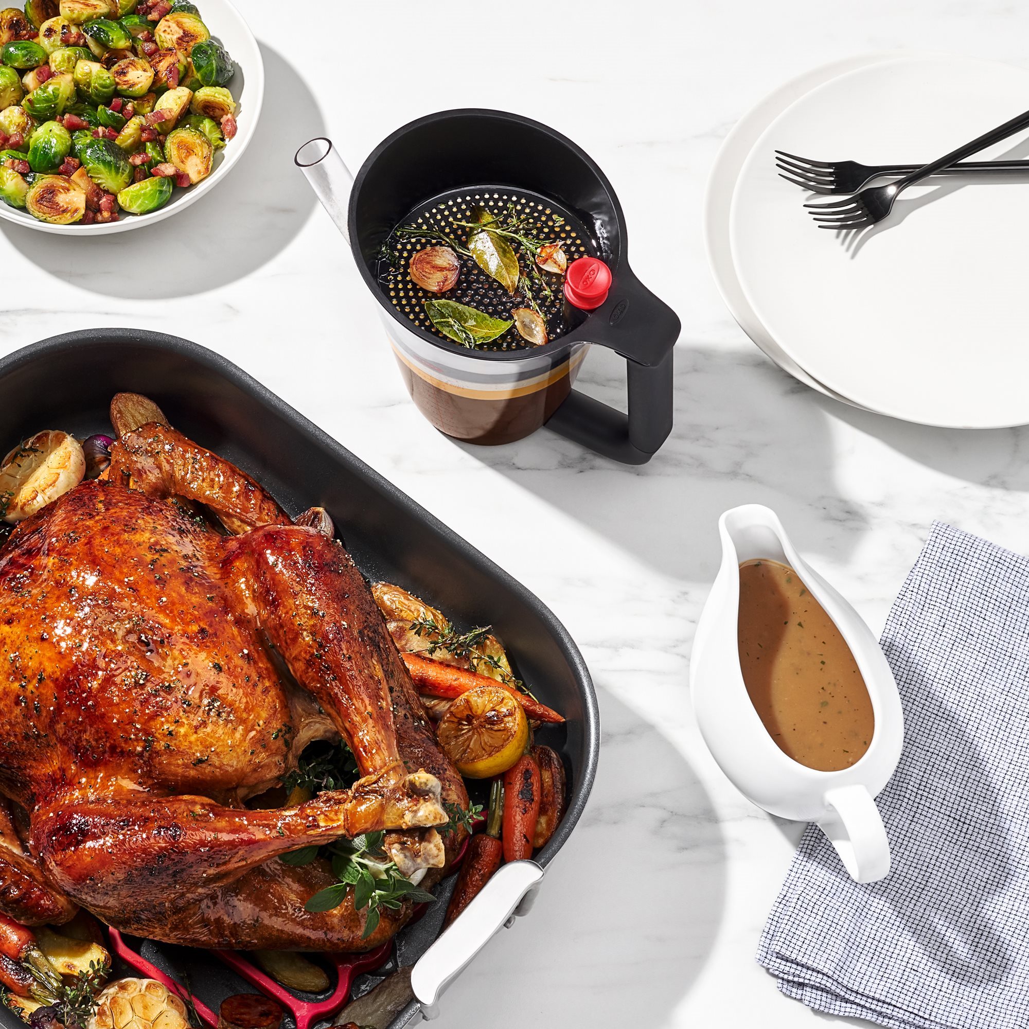 Αυτό το προϊόν είναι ιδανικό για το διαχωρισμό των λιπών και το σερβίρισμα σαλτσών. Απλώς βάλτε το πώμα στο στόμιο και, όταν ρίξετε τη σάλτσα, το κόσκινο θα χωρίσει τα ανεπιθύμητα κομμάτια και το λίπος θα μείνει από πάνω. Αφαιρέστε το πώμα και ρίξτε μέσα, και το αρωματικό υγρό μαγειρέματος θα χωριστεί, αφήνοντας το λίπος μέσα στο δοχείο. Οι σημάνσεις μέτρησης βοηθούν όταν μαγειρεύετε σύμφωνα με τις συνταγές και η ψηλή άκρη βοηθά στην αποφυγή πιτσιλίσματος κατά τη διάρκεια της έκχυσης.
