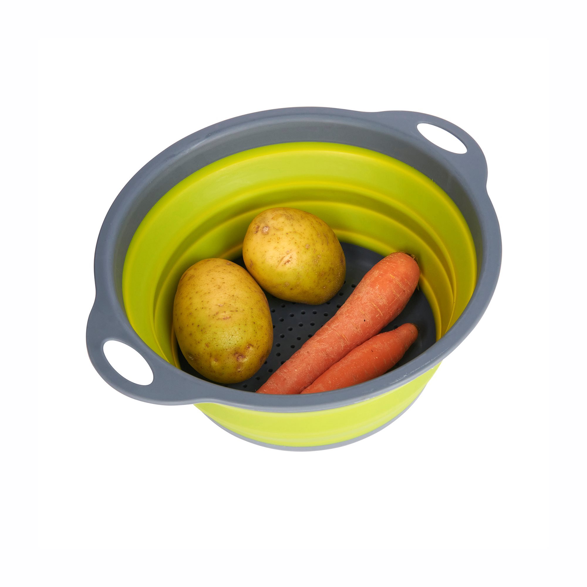 Πτυσσόμενο τρυπητό, διαμέτρου 24 cm, από πράσινη σιλικόνη, ανθεκτικό στη θερμότητα έως 260°C, με λαβές και γκρι κόσκινο, μάρκας Kitchen Craft