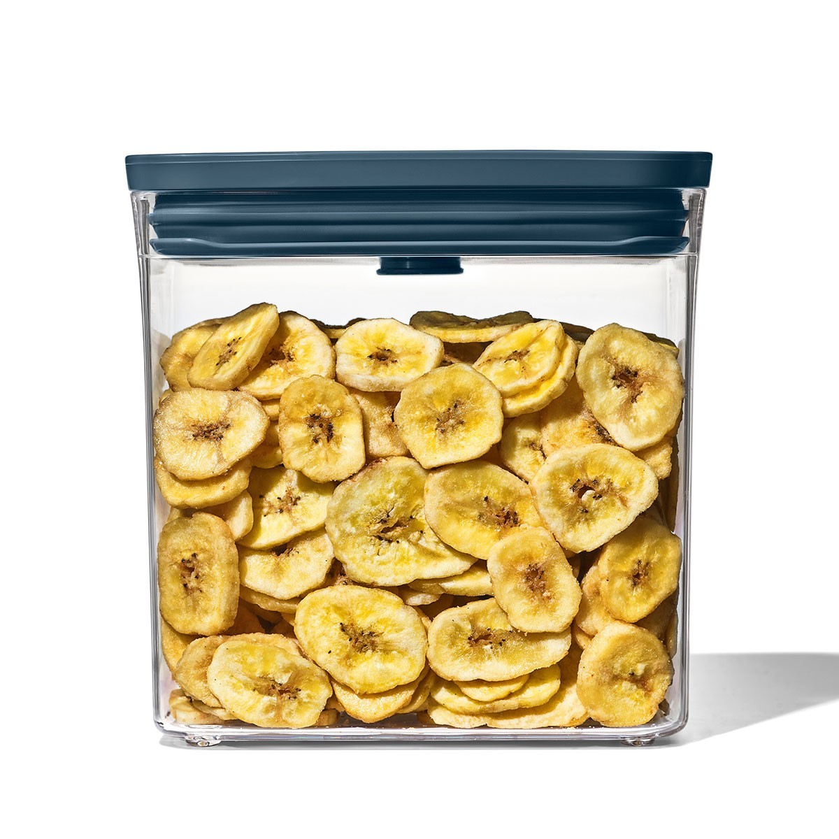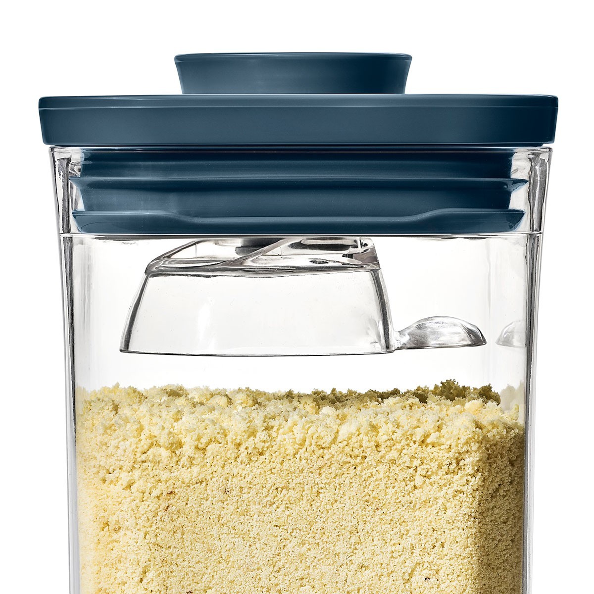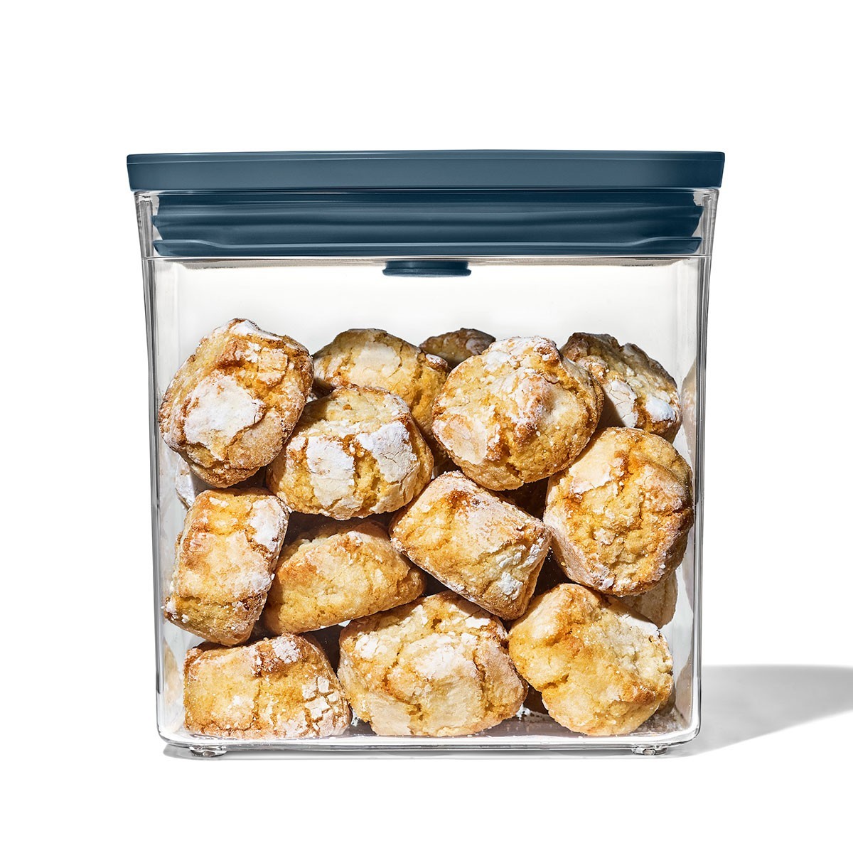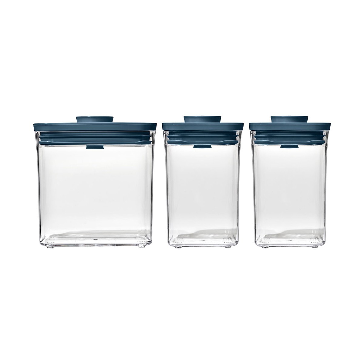 POP food storage container set, 3 pieces, OXO brand, fitted with Storm Blue limited edition lids. This modern shade adds a decorative touch to your kitchen.