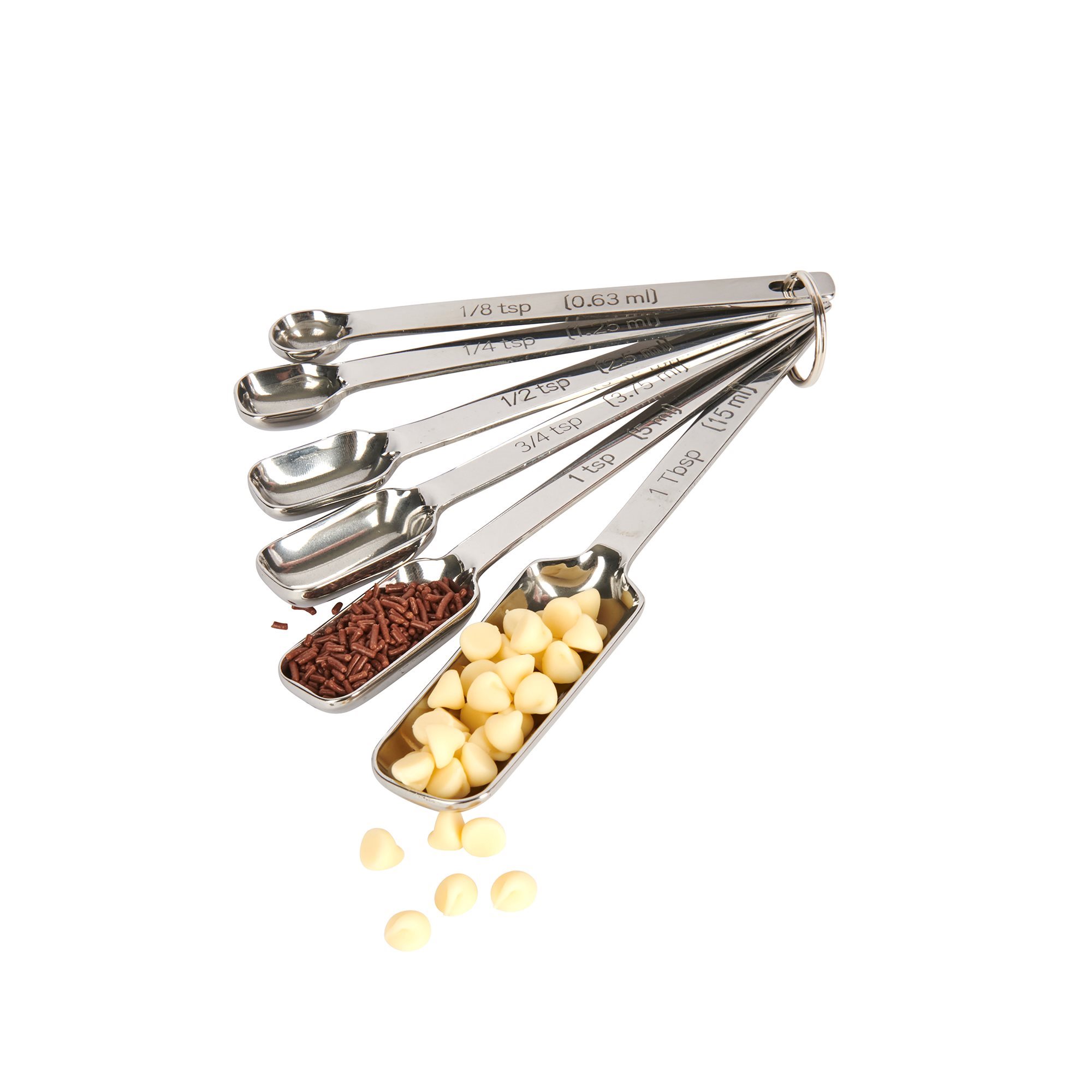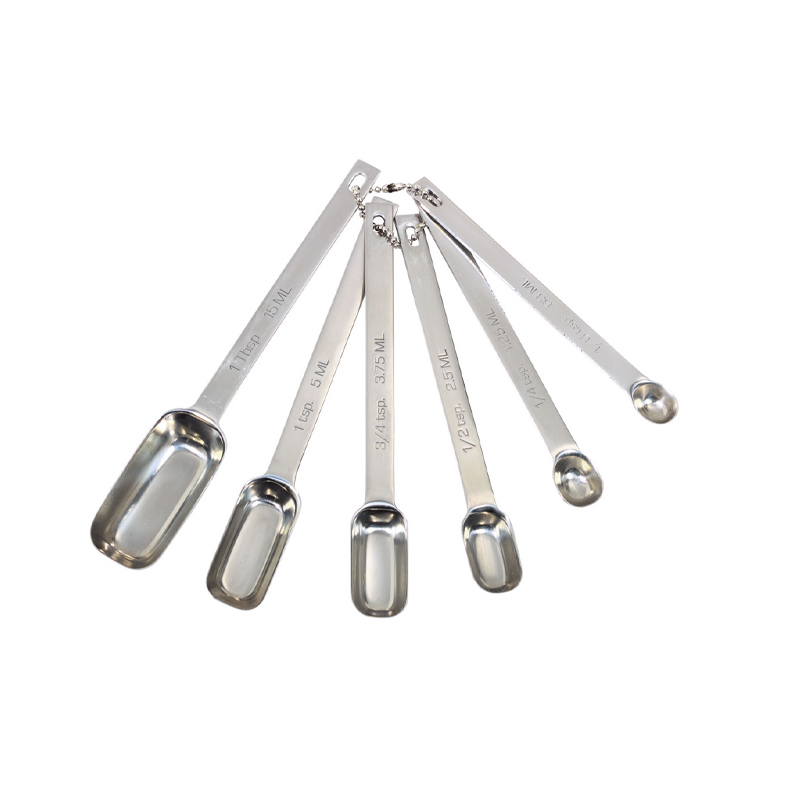 The set includes 6 measuring spoons with measurement units such as teaspoon (tsp), tablespoon (Tbs) and ml.