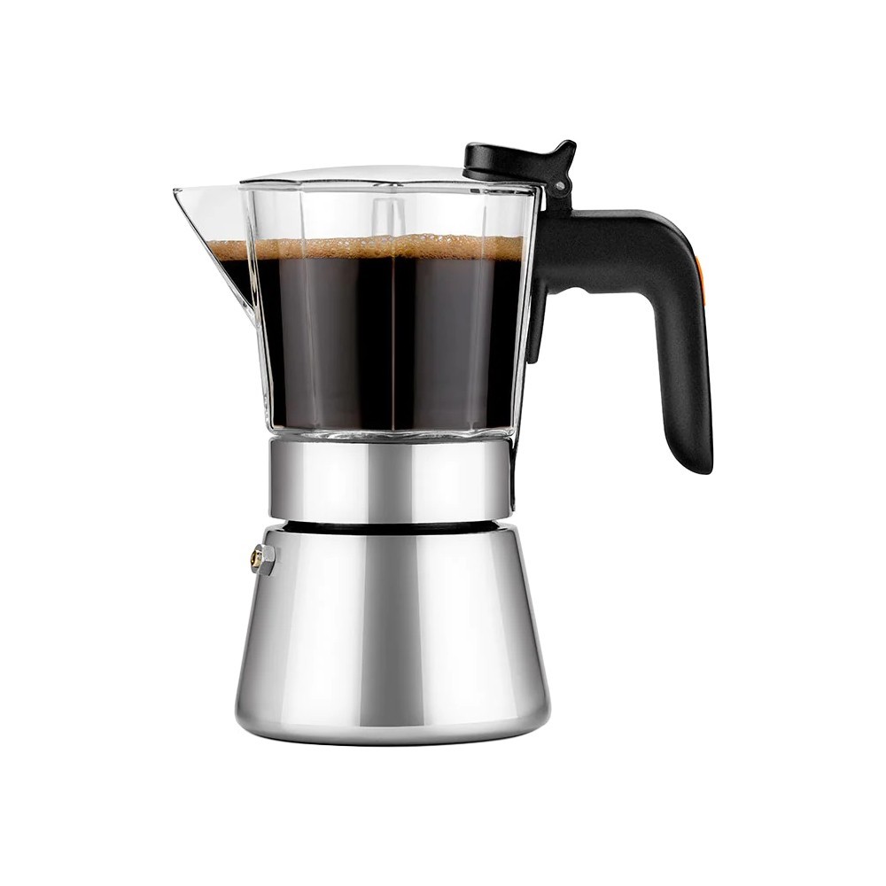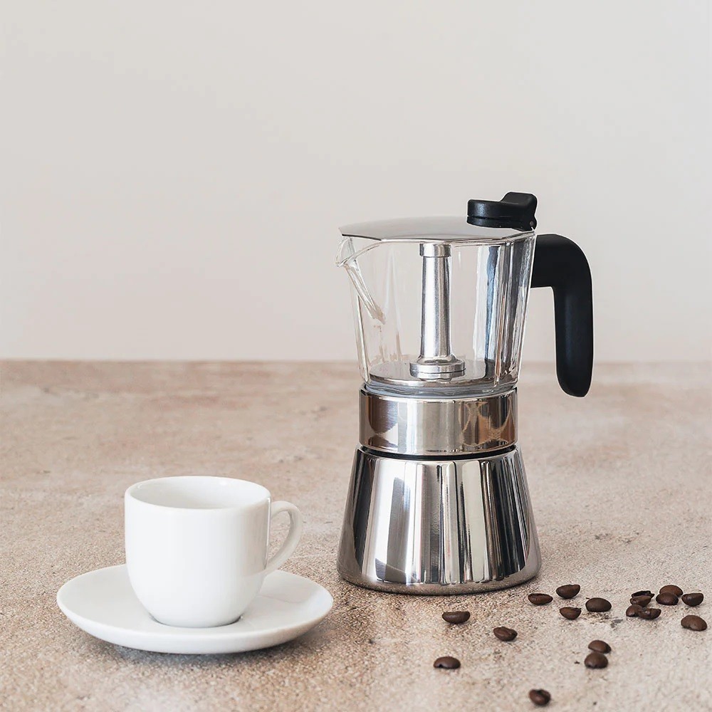 The coffee maker, with a capacity of 280 ml, is made from stainless steel and borosilicate glass. The thickness of the ferritic stainless steel lower body provides great resistance to deformation and allows for maximum efficiency on induction hobs. The base is suitable for all types of hobs, including induction.