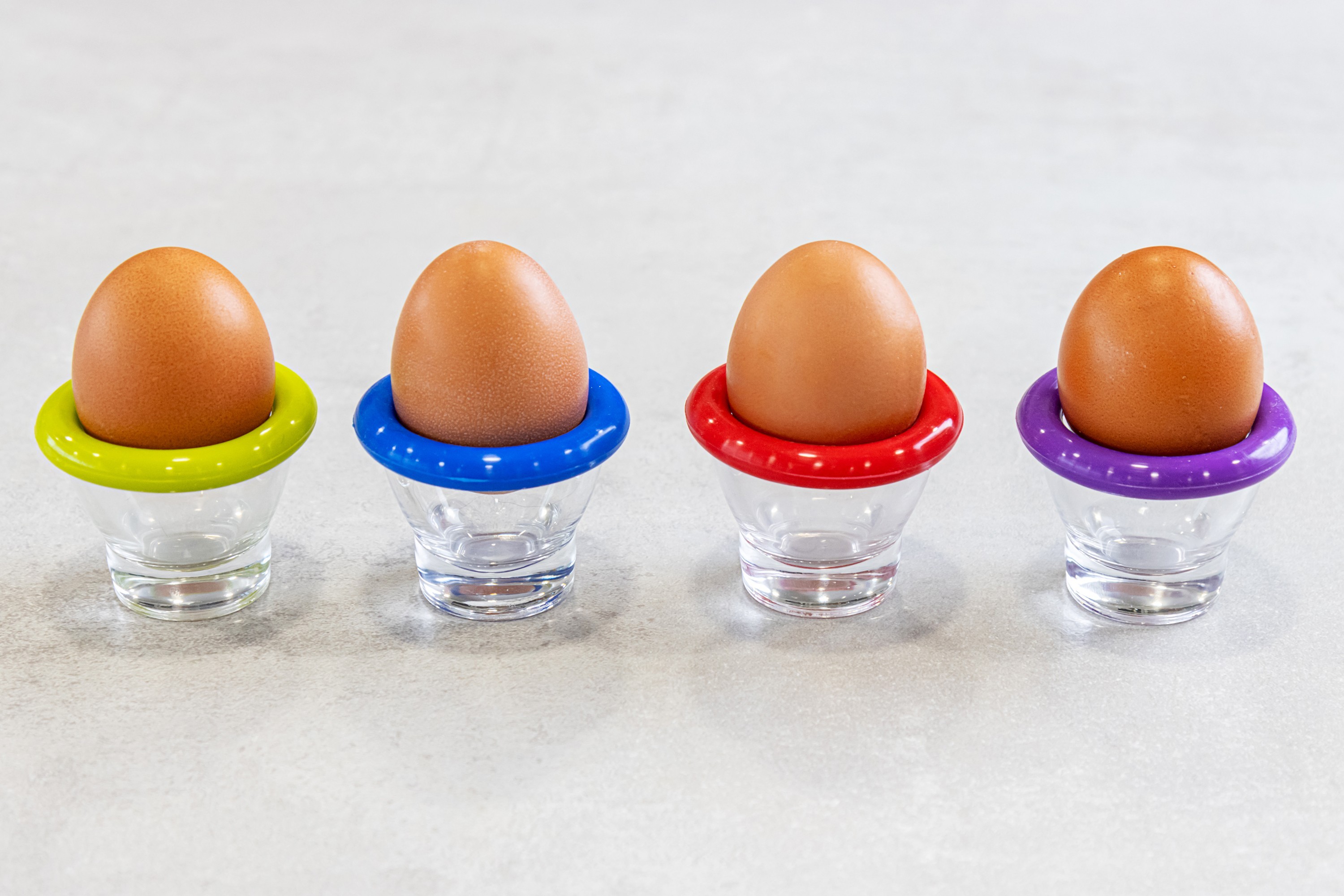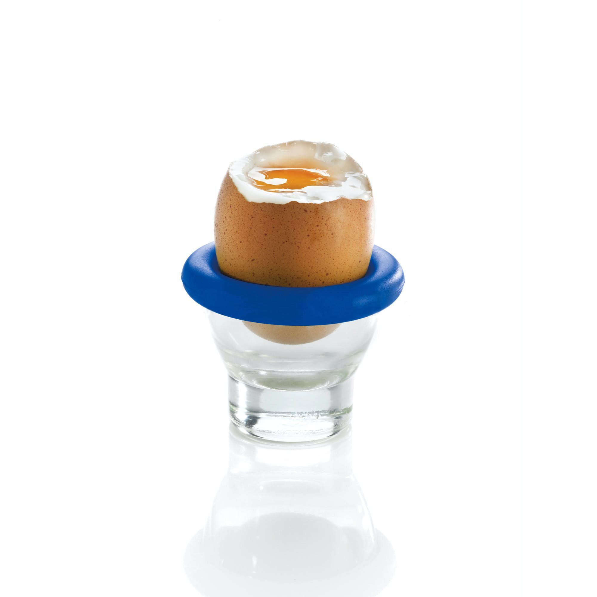 Boiled eggs holder, Kitchen Craft brand, made of glass, with protective ring made of silicone.