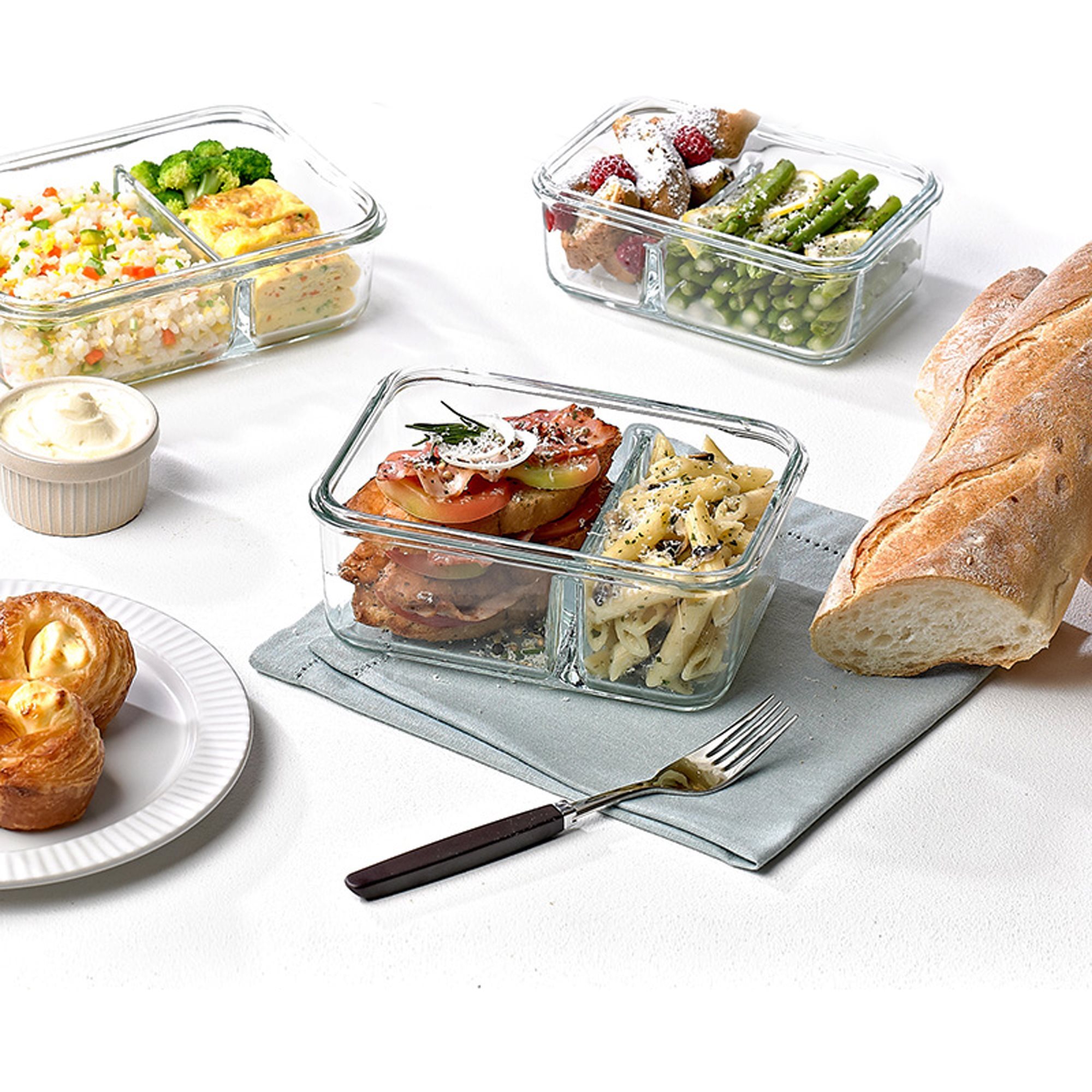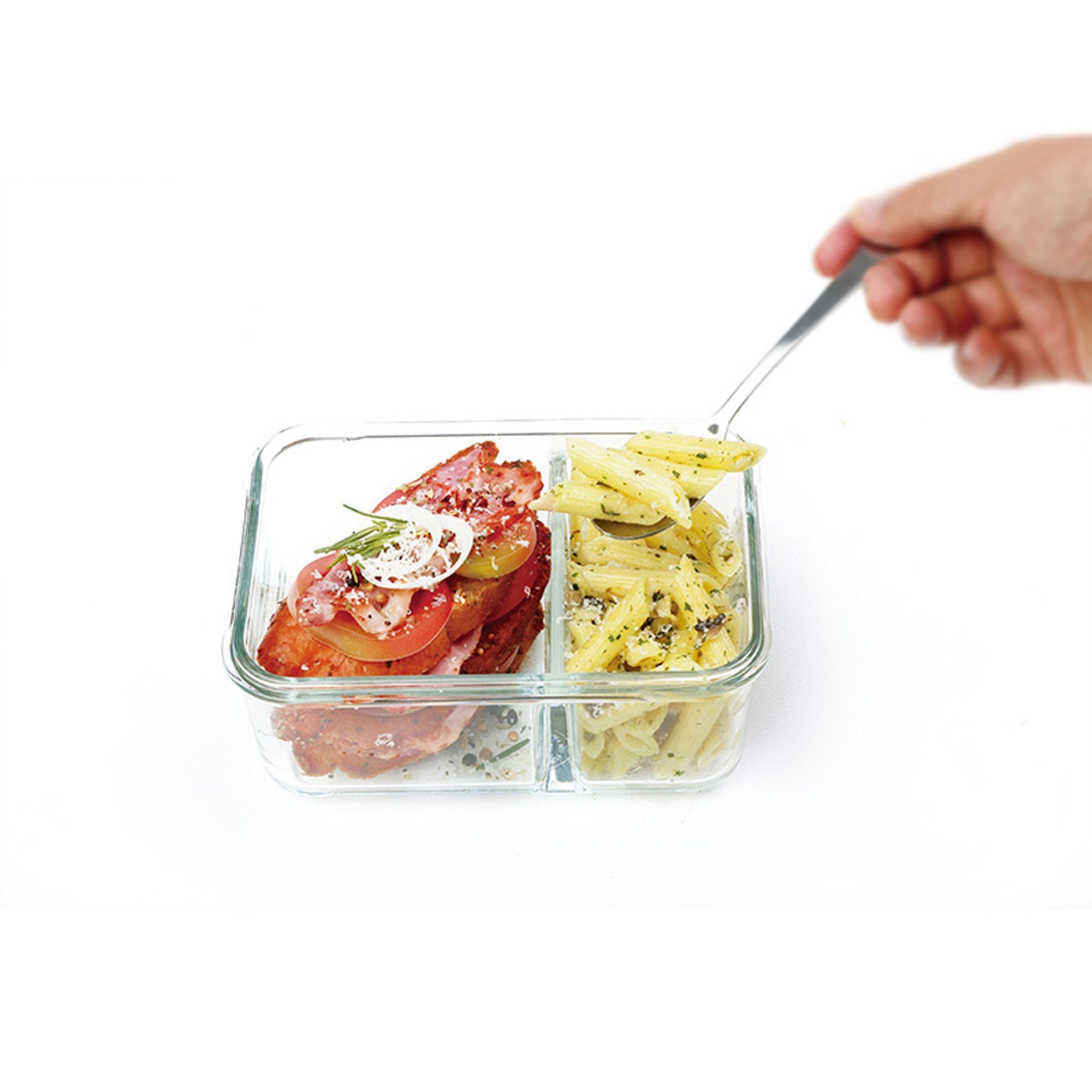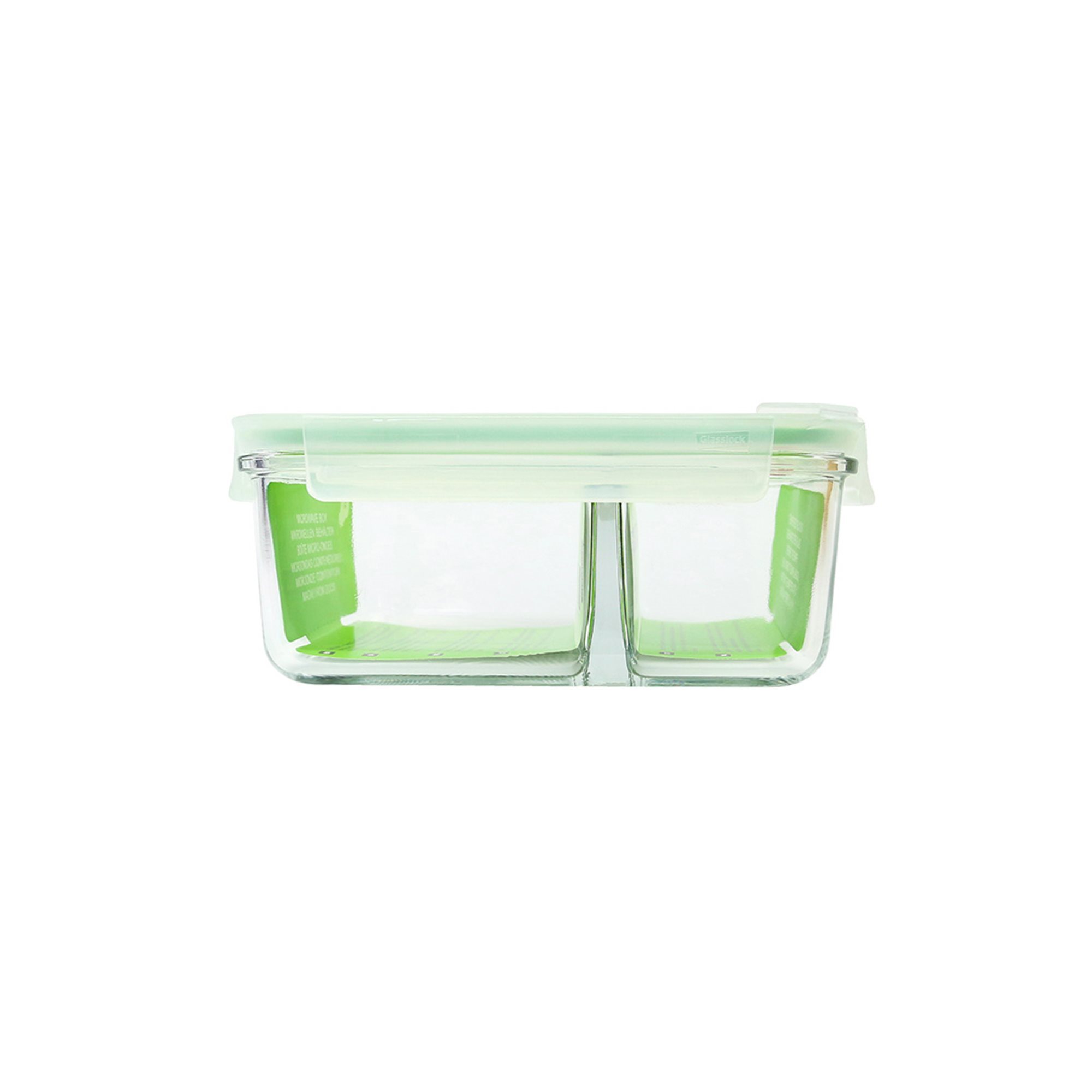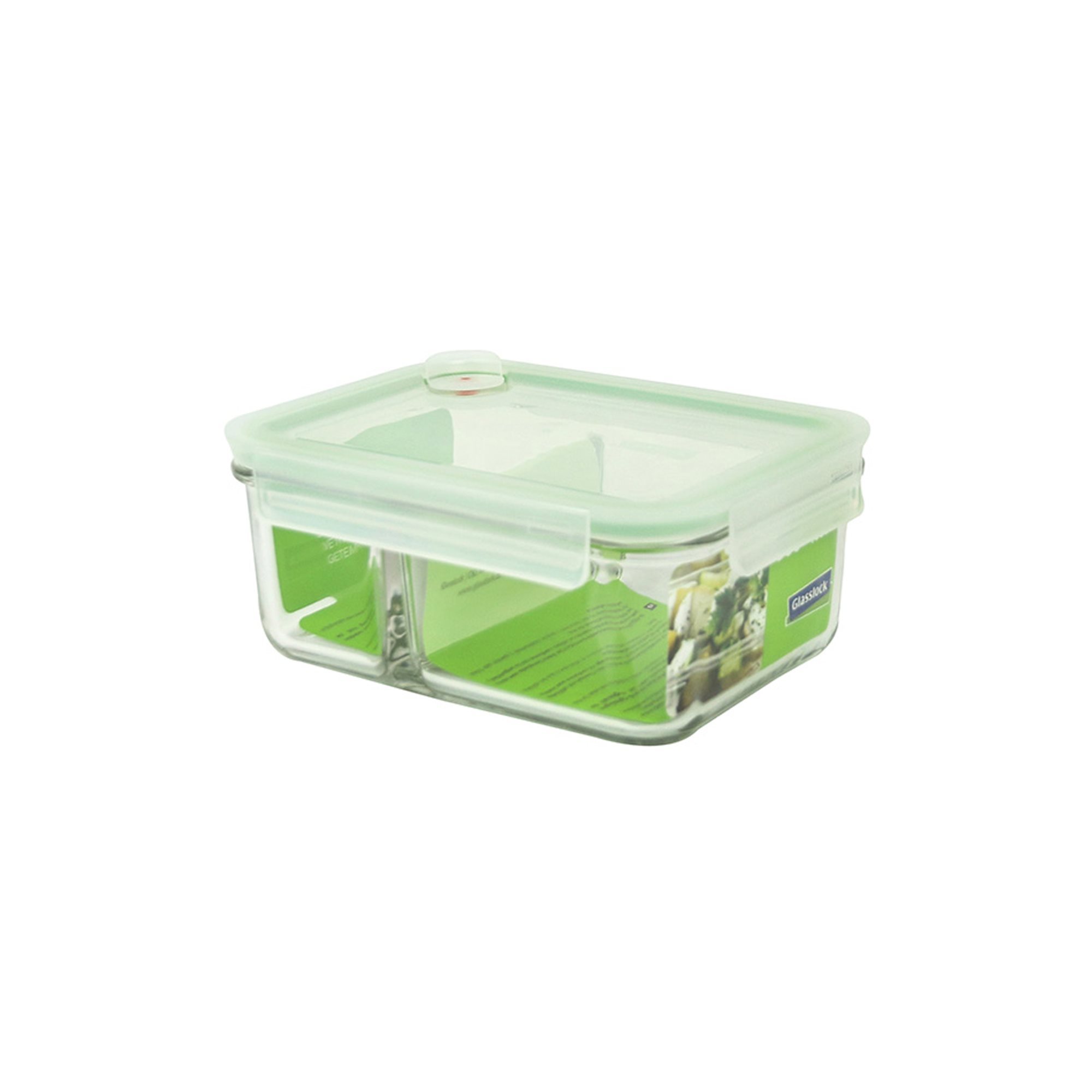 Food storage container with 2 compartments and plastic lid, produced by Glasslock, capacity of 1000 ml, dimensions of 17.7 x 13 x 6.8 cm, made from special glass, which is resistant to temperatures between -20 and +120°C.