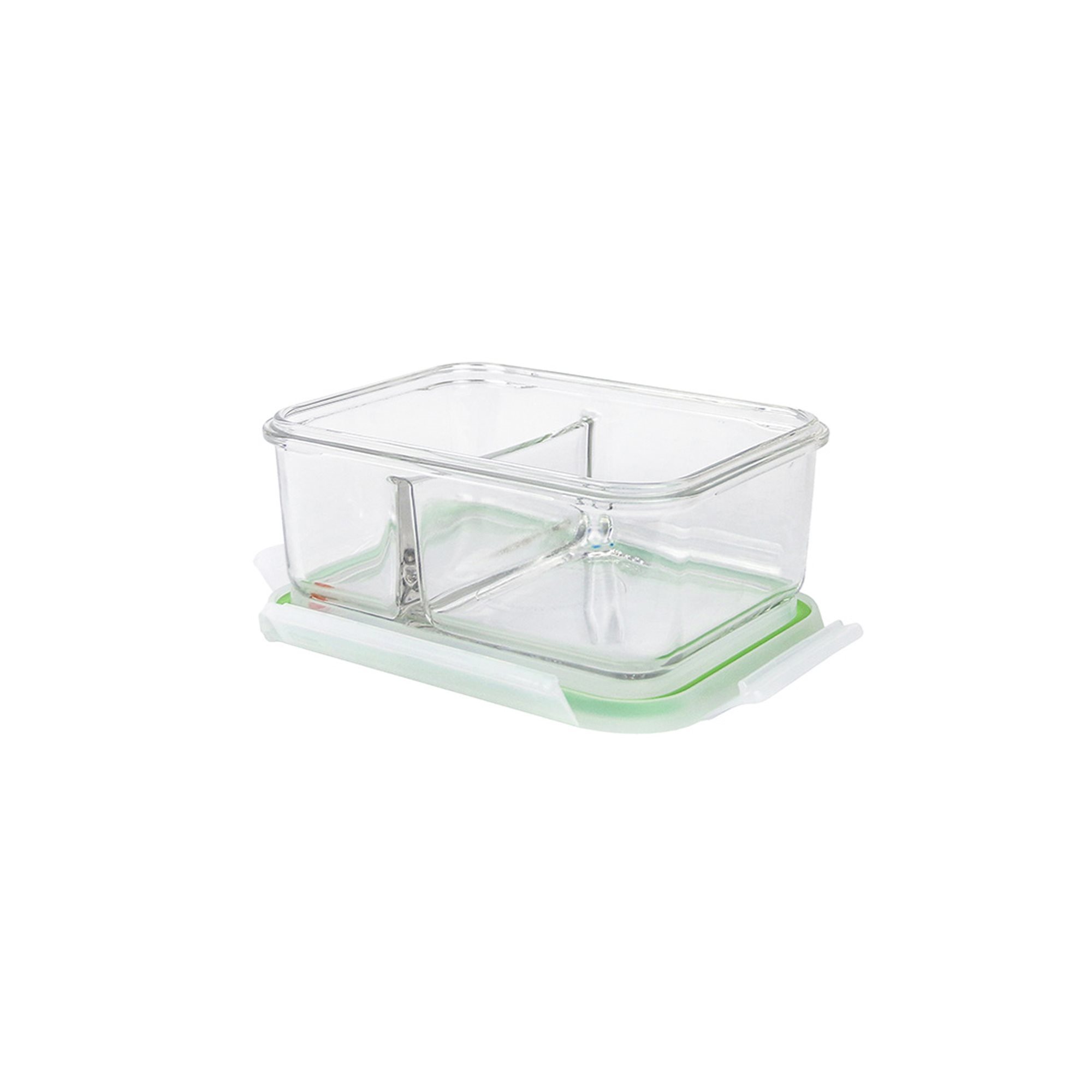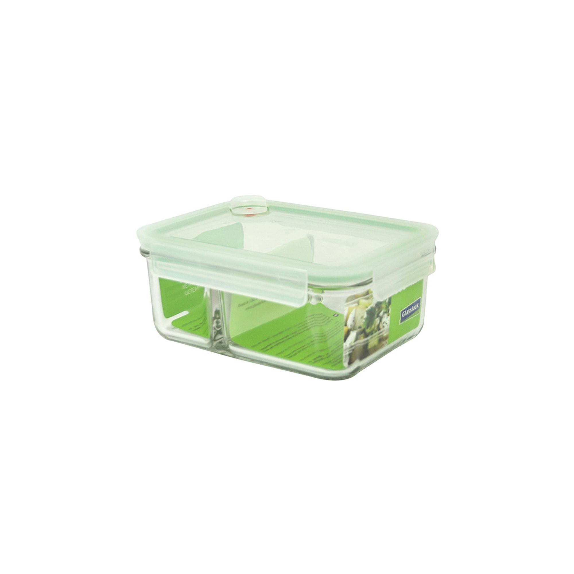 Food storage container with 2 compartments and plastic lid, produced by Glasslock, capacity of 670 ml, dimensions of 16.4 x 11.5 x 5.7 cm, made from special glass that is resistant to temperatures between -20 and +120°C.