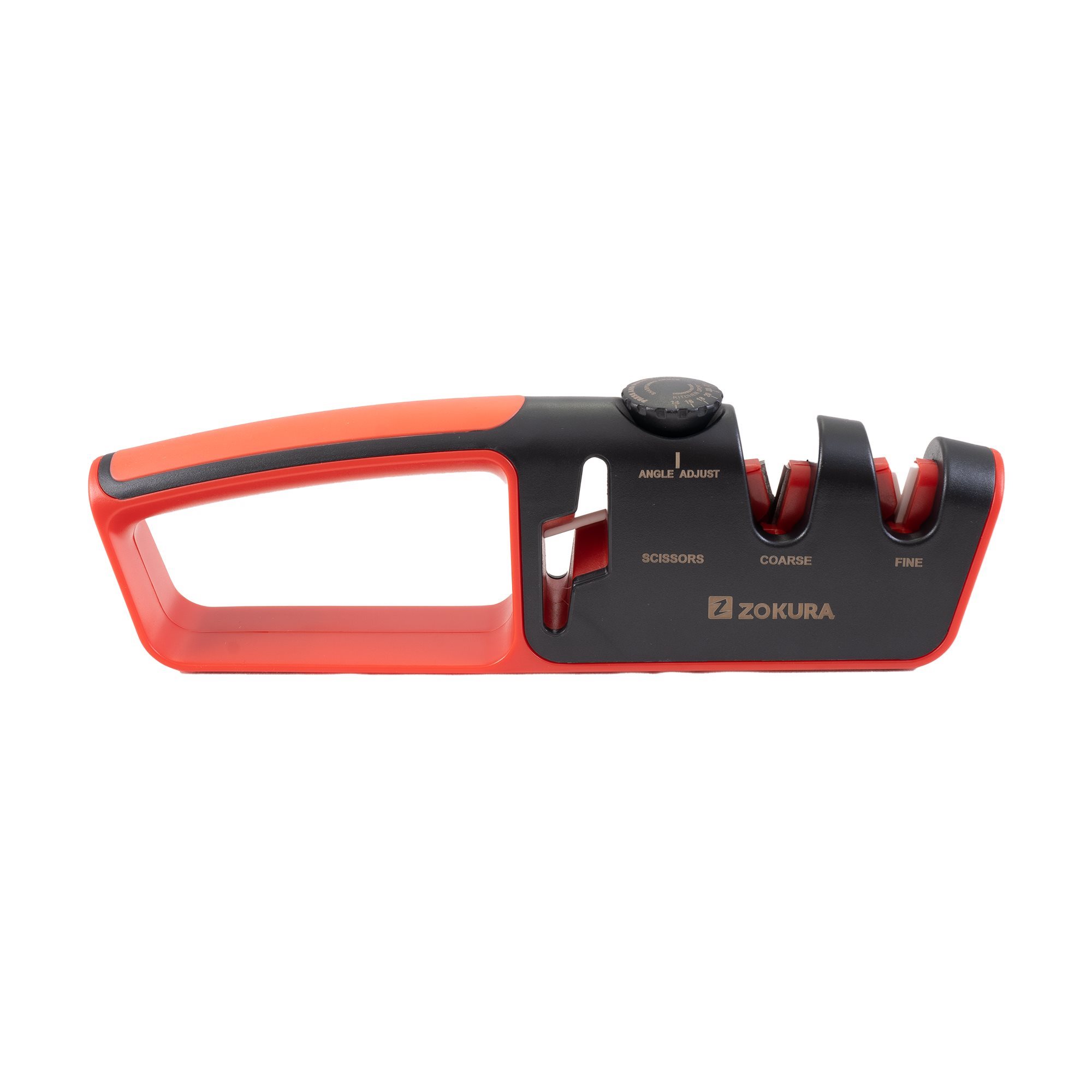 Knife sharpener with 2 modules for blade sharpening and scissors sharpening slot, Zokura brand.