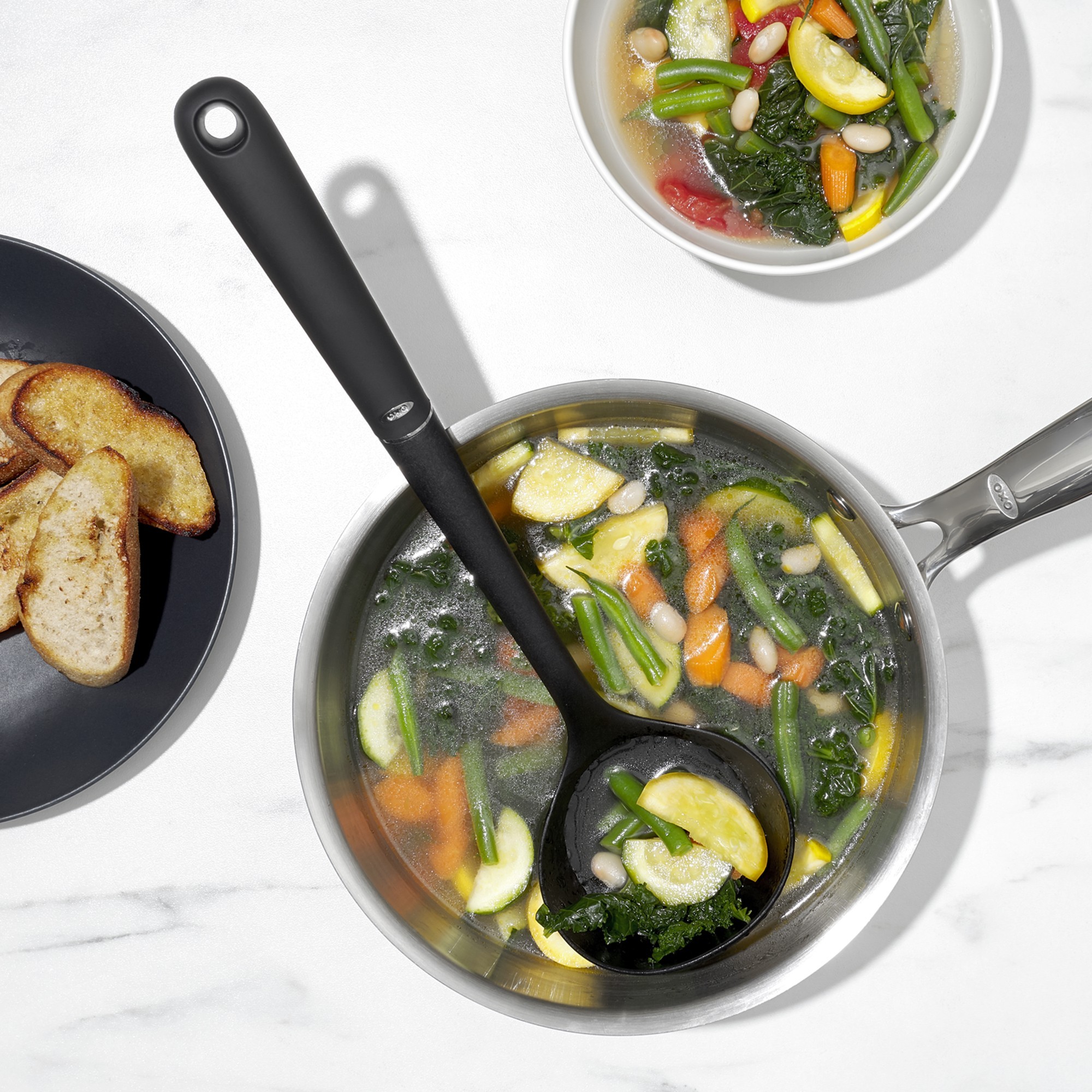 The elegant ladle is provided with ergonomic handle and loop for storing.
