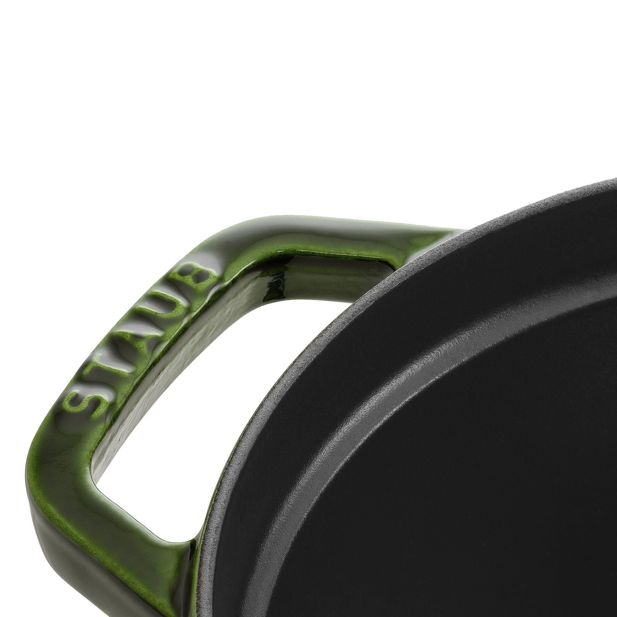 On the inside, the dish is provided with a layer of matte black enamel produced by Staub through special technologies that offer advantages in the case of cooking techniques such as simmering, baking or caramelization. The oils (fats) used during cooking will penetrate the pores of the matte enamel and create a smooth natural non-stick surface. That is why the Staub cookware get better and better as the years go by, as you use them.
