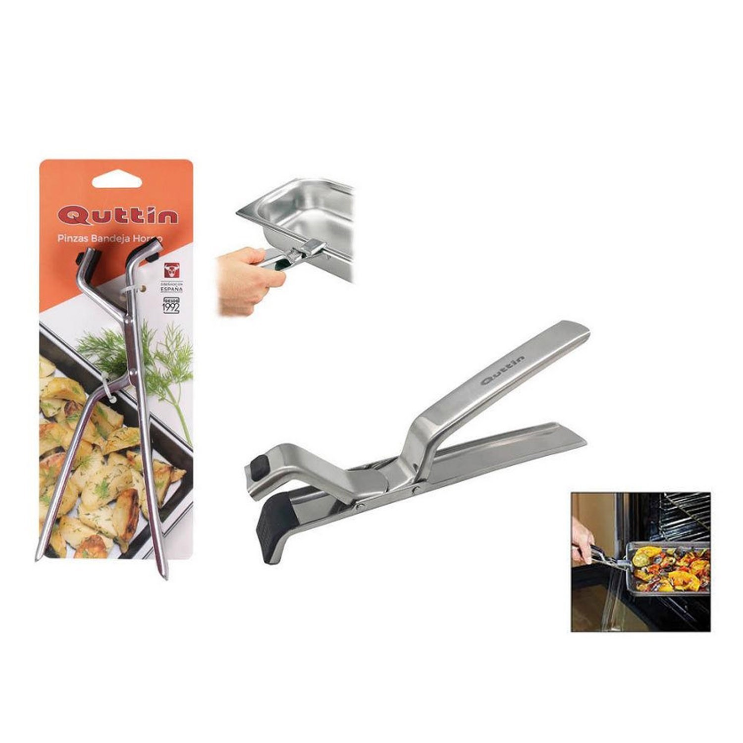 Oven tongs, produced by Quttin, made of stainless steel, with dimensions of 19 × 7.2 × 2.6 cm.