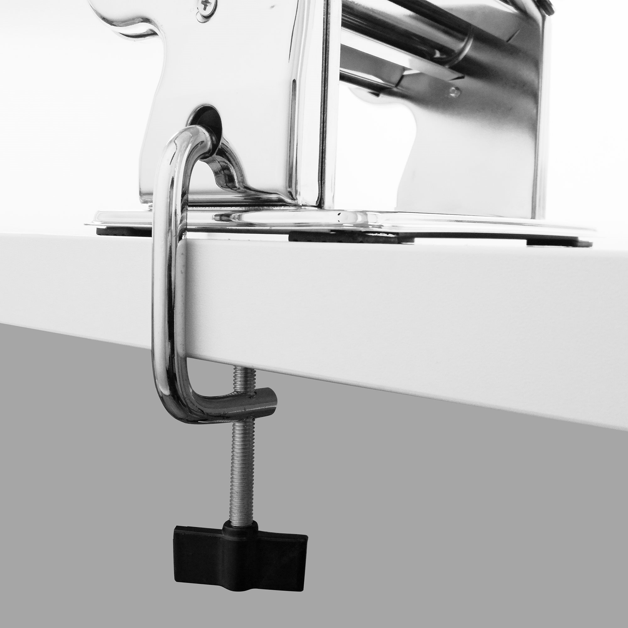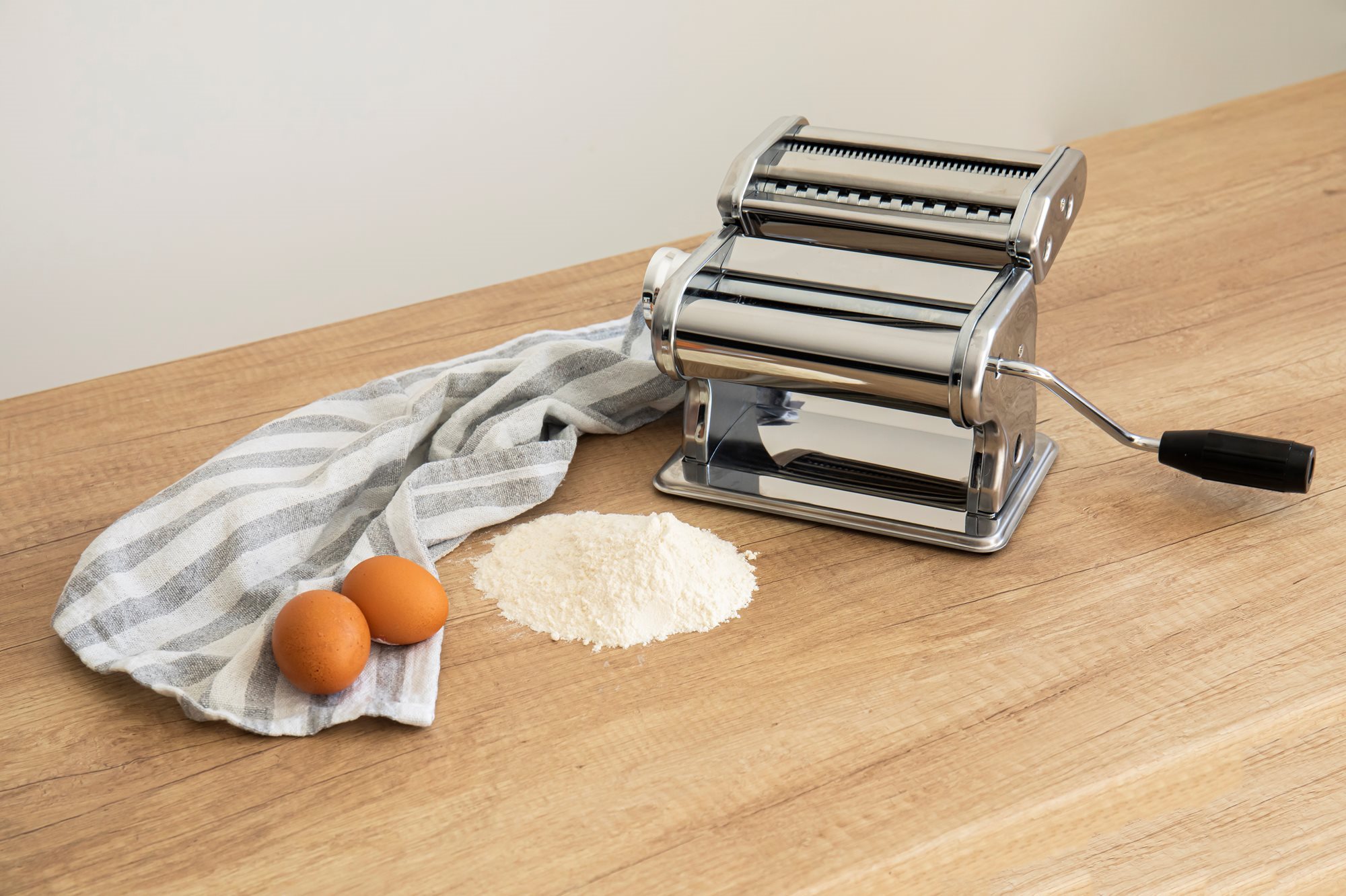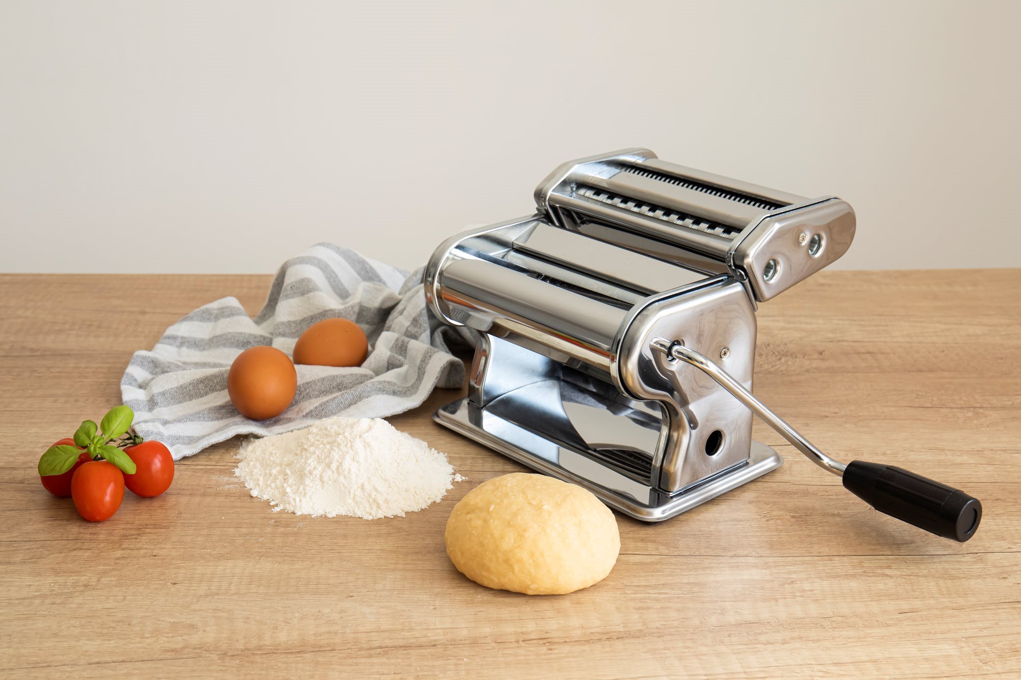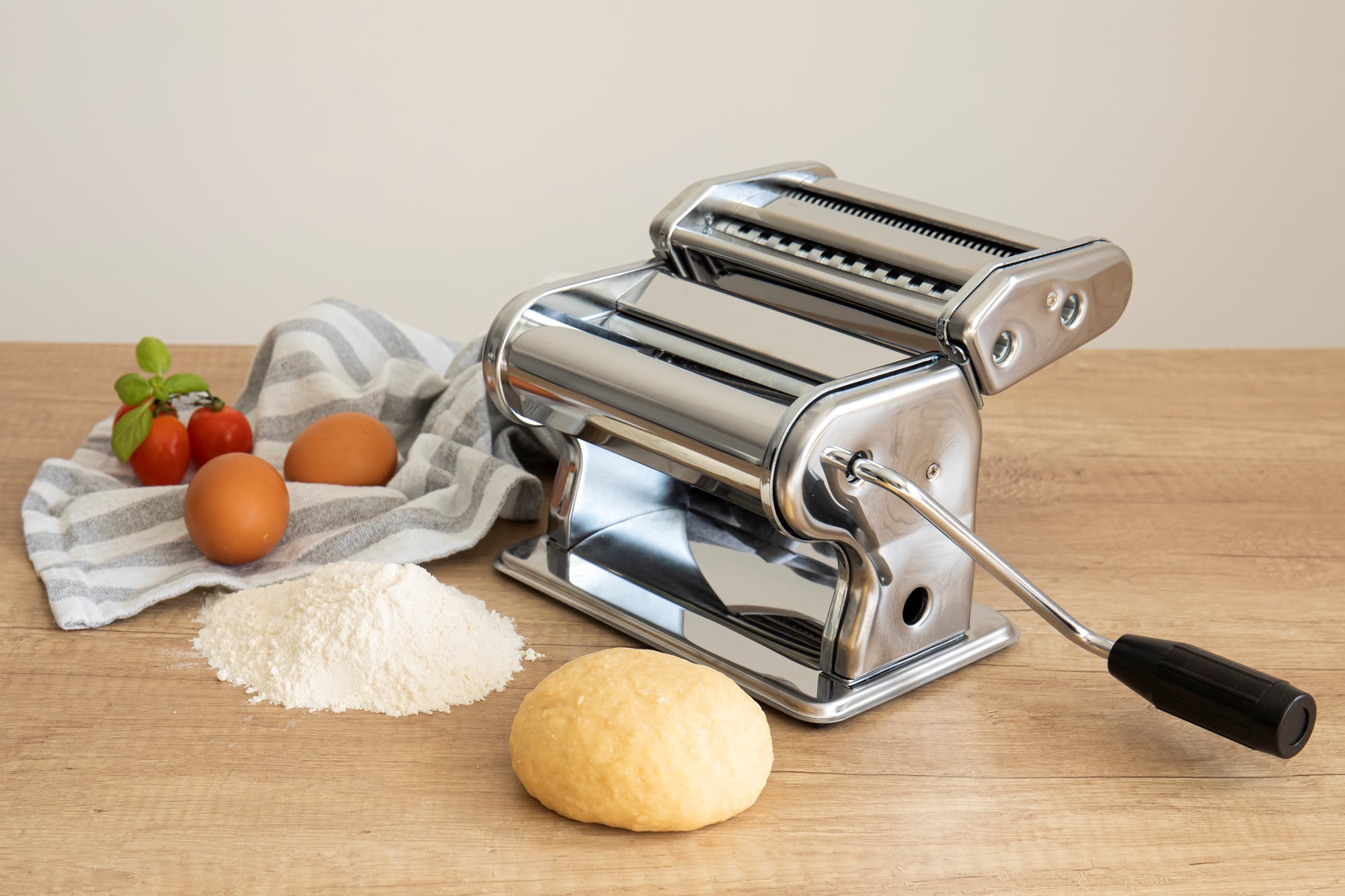 The roller creates a 150 mm wide pasta sheet. The machine rolls dough in 9 different thickness adjustment settings.