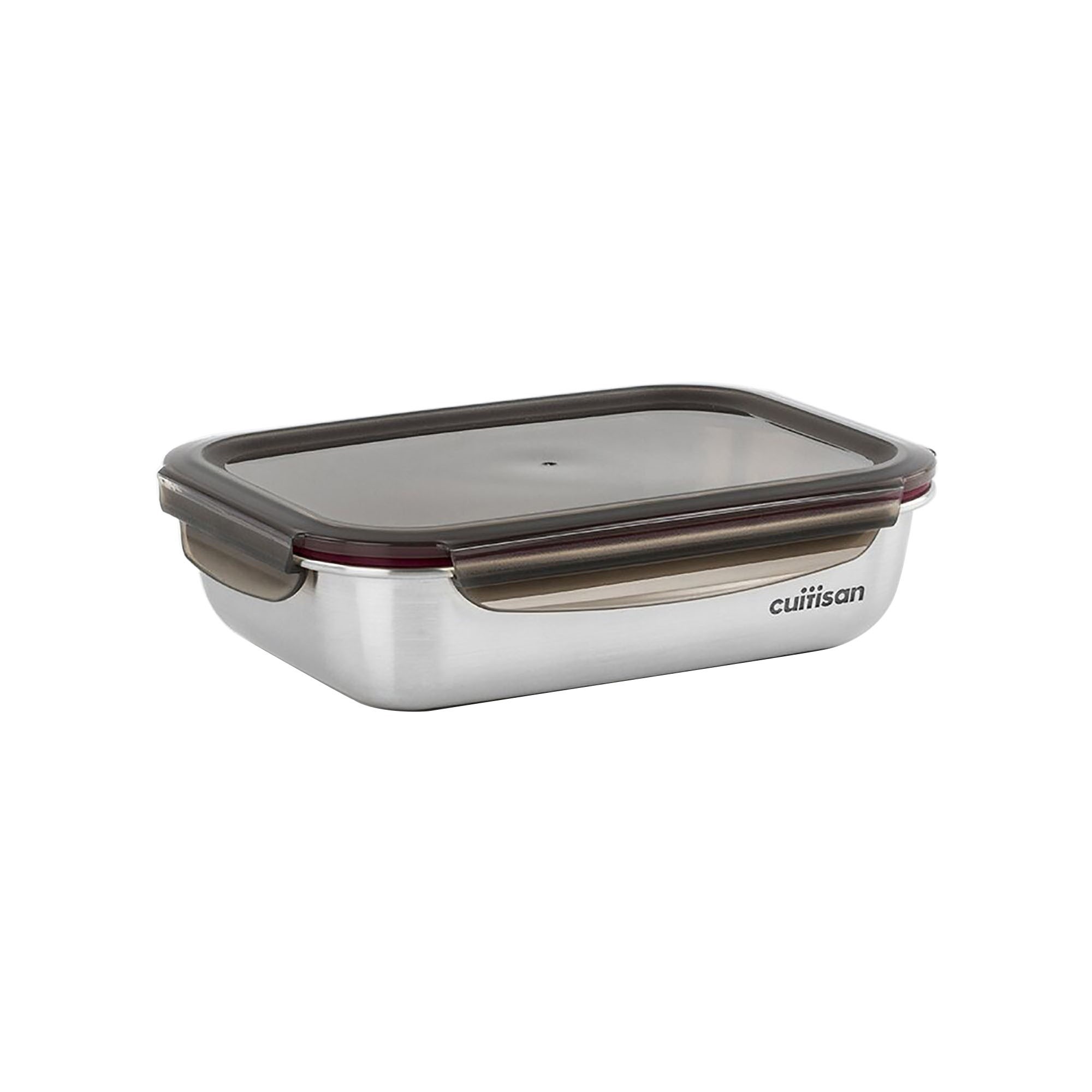 Rectangular food storage container, Cuitisan brand with a capacity of 1900 ml, size 259 × 195 × 71 mm, made of "Cromosteel" stainless steel, with polypropylene lid.