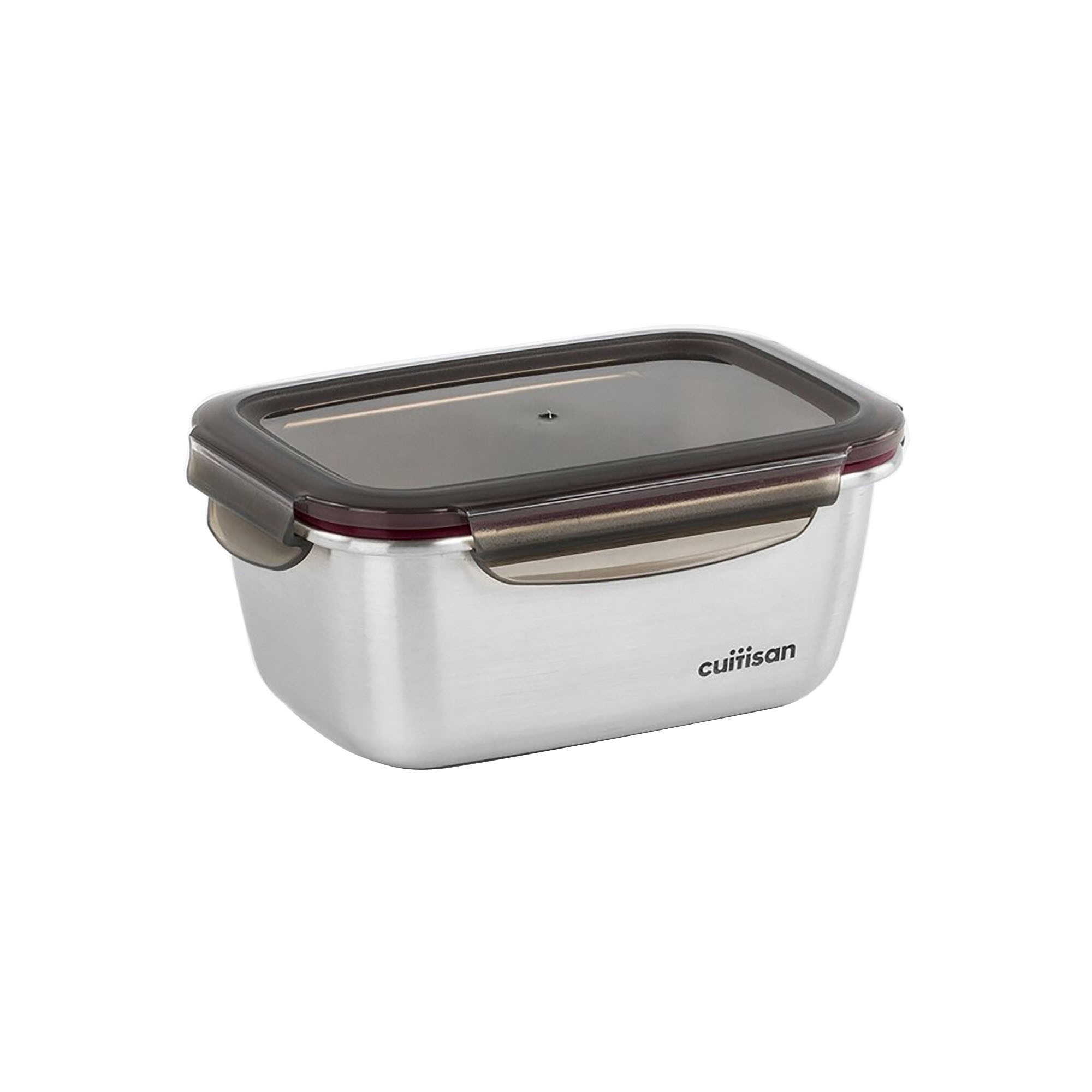 Rectangular food storage container, Cuitisan brand with a capacity of 980 ml, size 184 × 130 × 83 mm, made of "Cromosteel" stainless steel, with polypropylene lid.