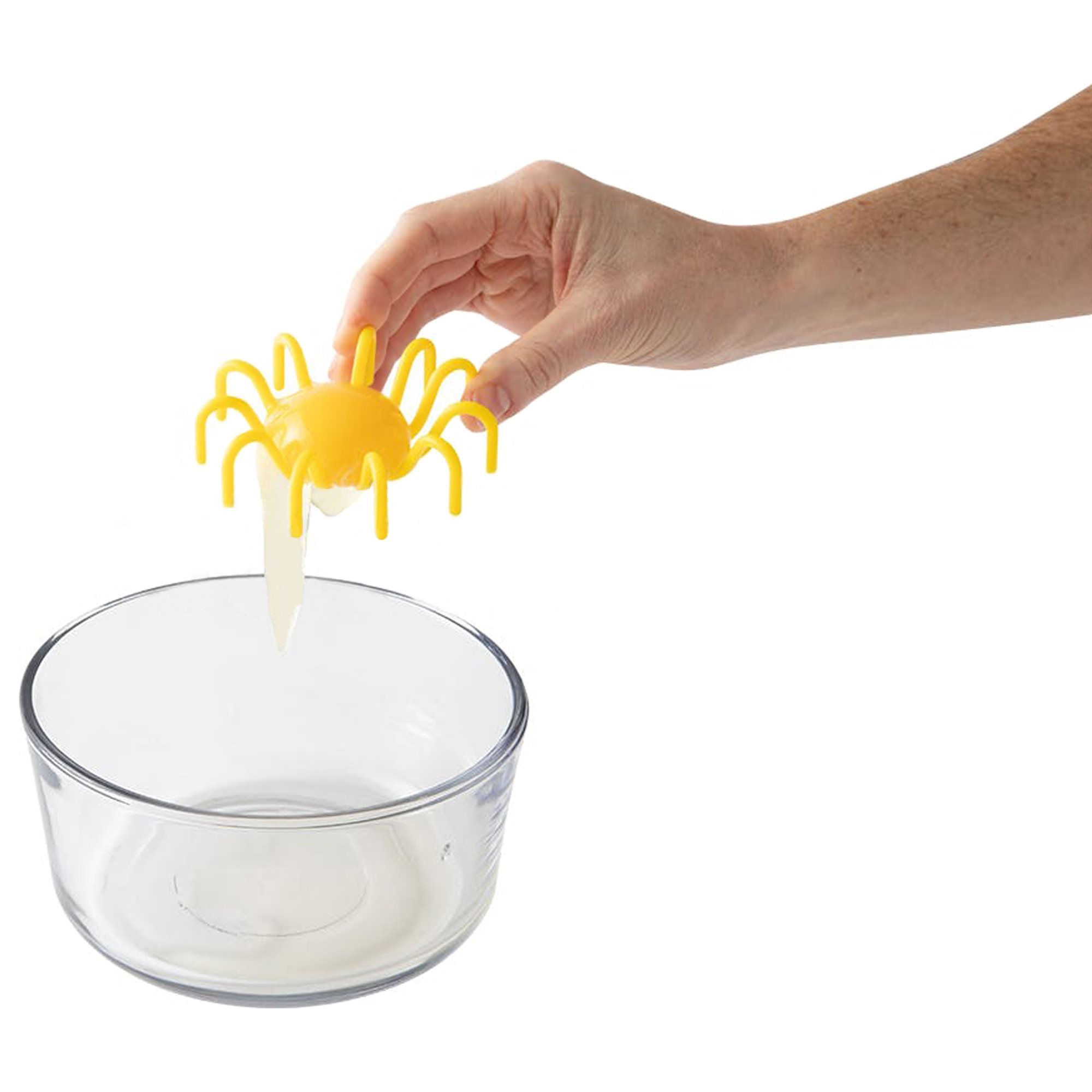 Support the egg separator by hooking its 3 small feet to the rim of mixing bowls and mugs of any size.