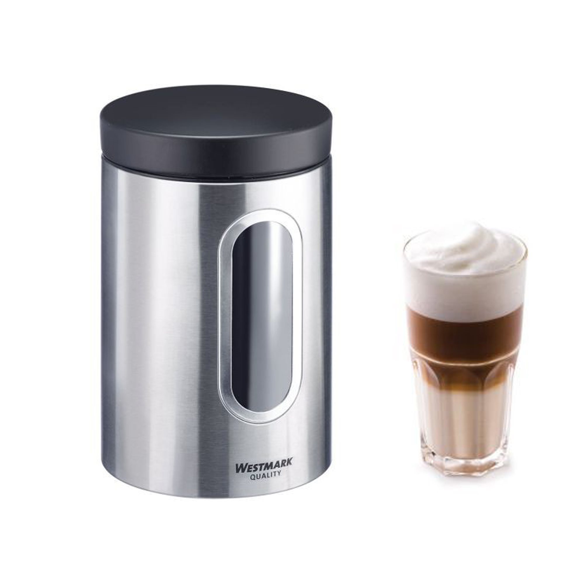 Storage container with transparent window, made by Westmark, capacity 500 g, made out of stainless steel.