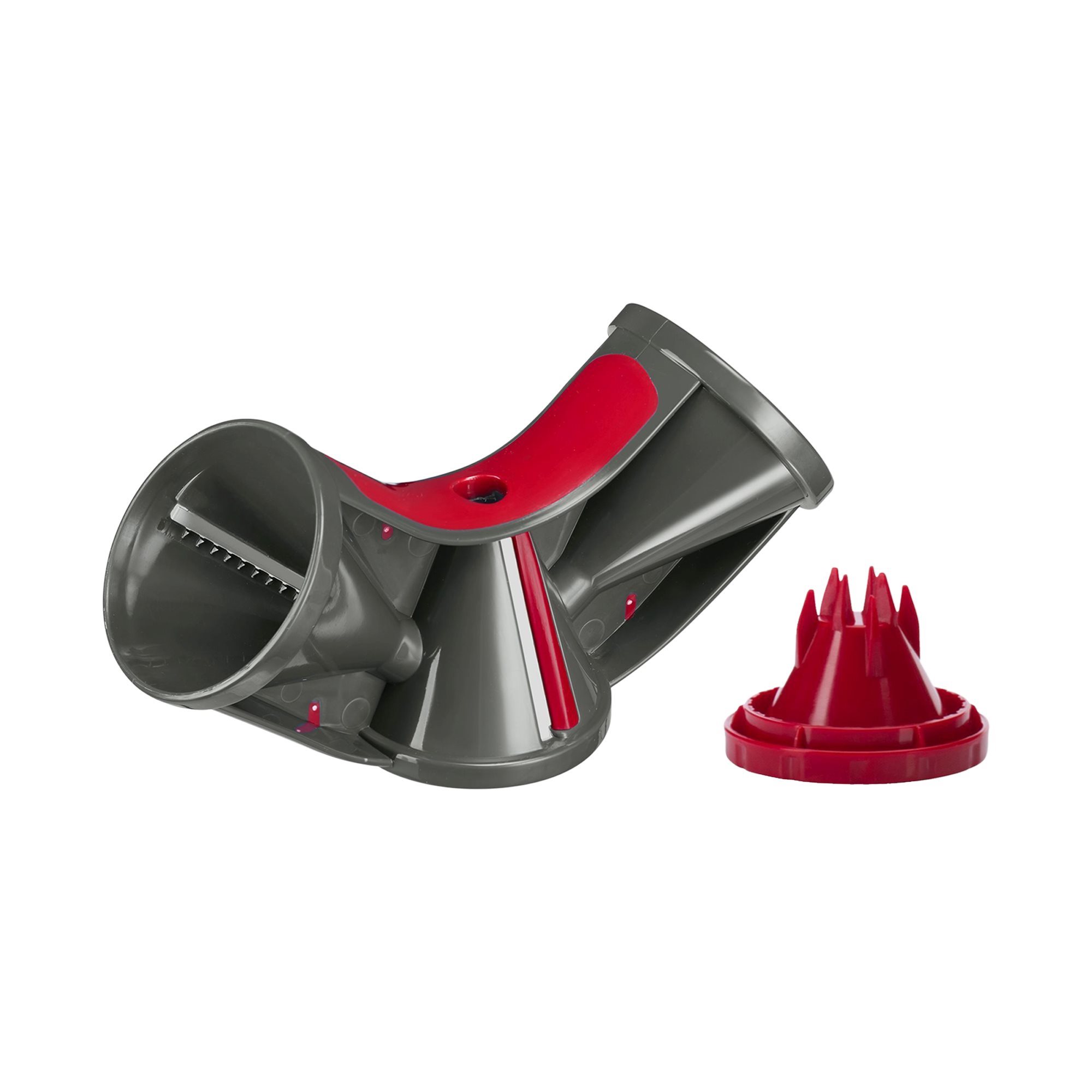 It has 3 interchangeable blades, made out of stainless steel, which will help you cut into spirals and julienne, to grind food (in a coarse and fine manner) and to mince. This product is equipped with a device that grasps the fruit / vegetable, so that the user can safely maneuver the slicer, without the hand approaching the blade.