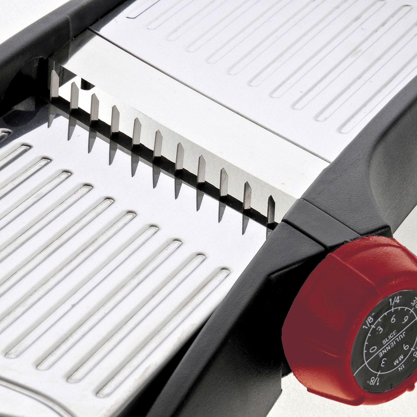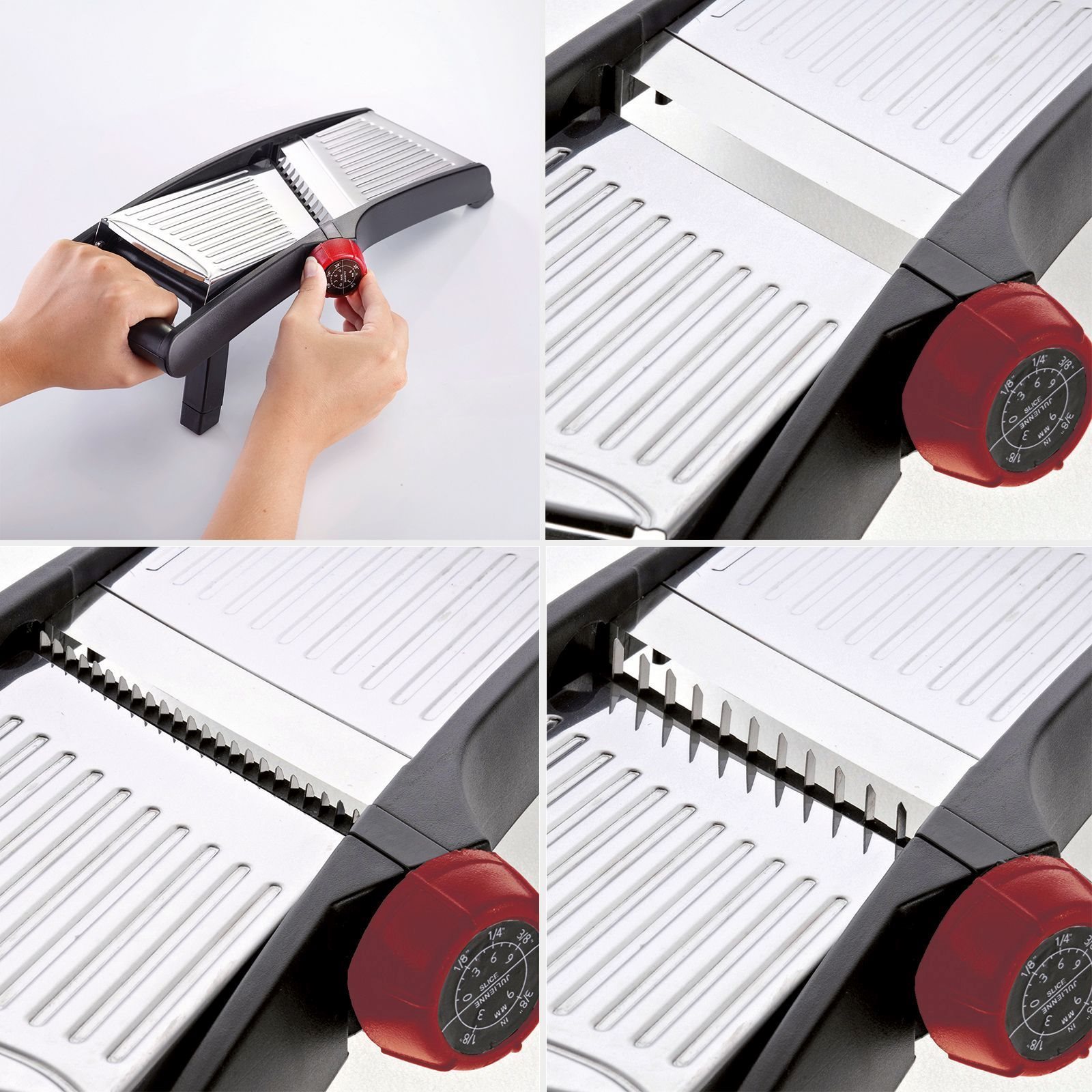 With this slicing device you have several slicing options - without complicated blade changing actions. Simply press the button clockwise to choose the desired slicing option.