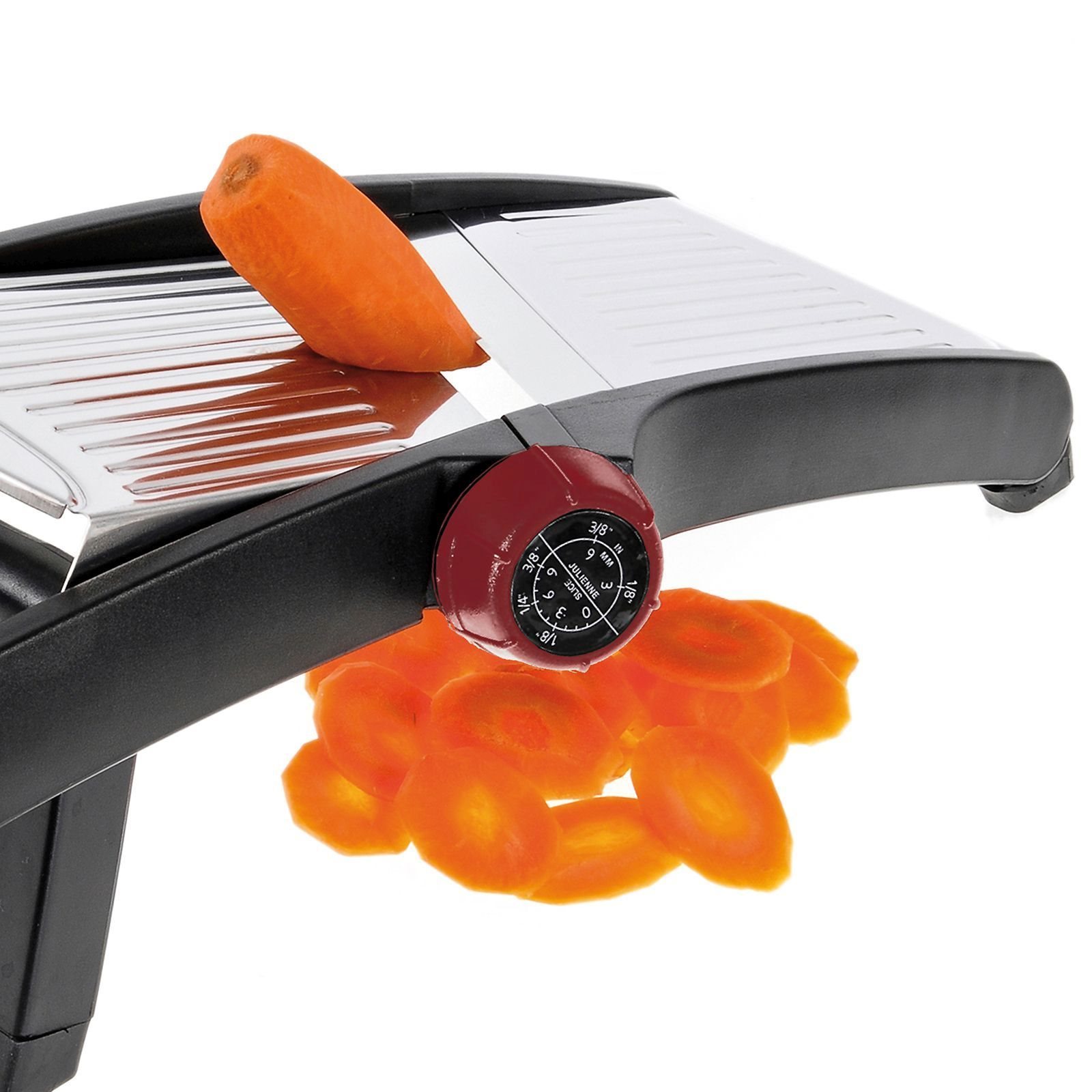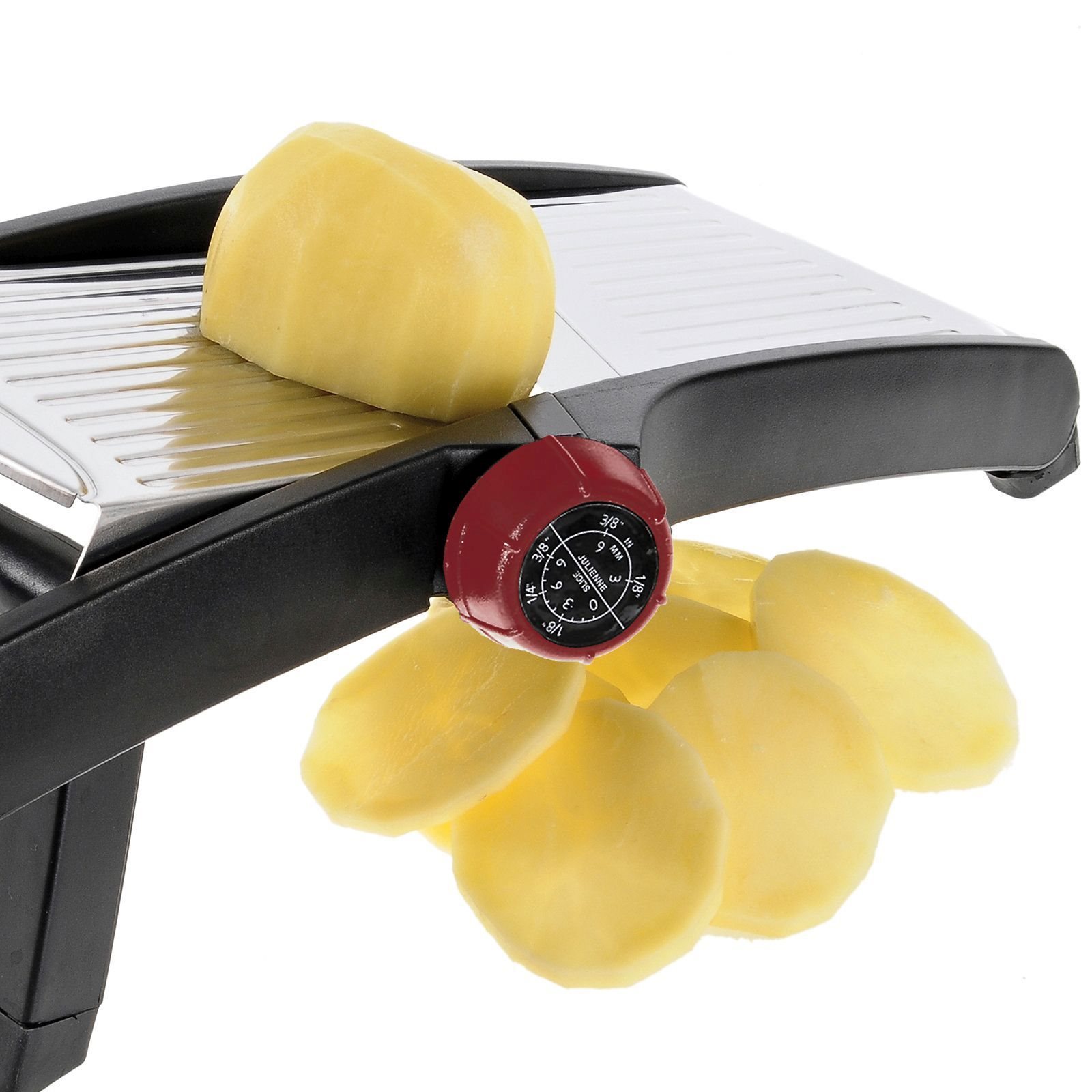 You have the option to choose between julienne slicing - large (ideal for french-fried potatoes) or small and at the same time you can select the slicing thickness.