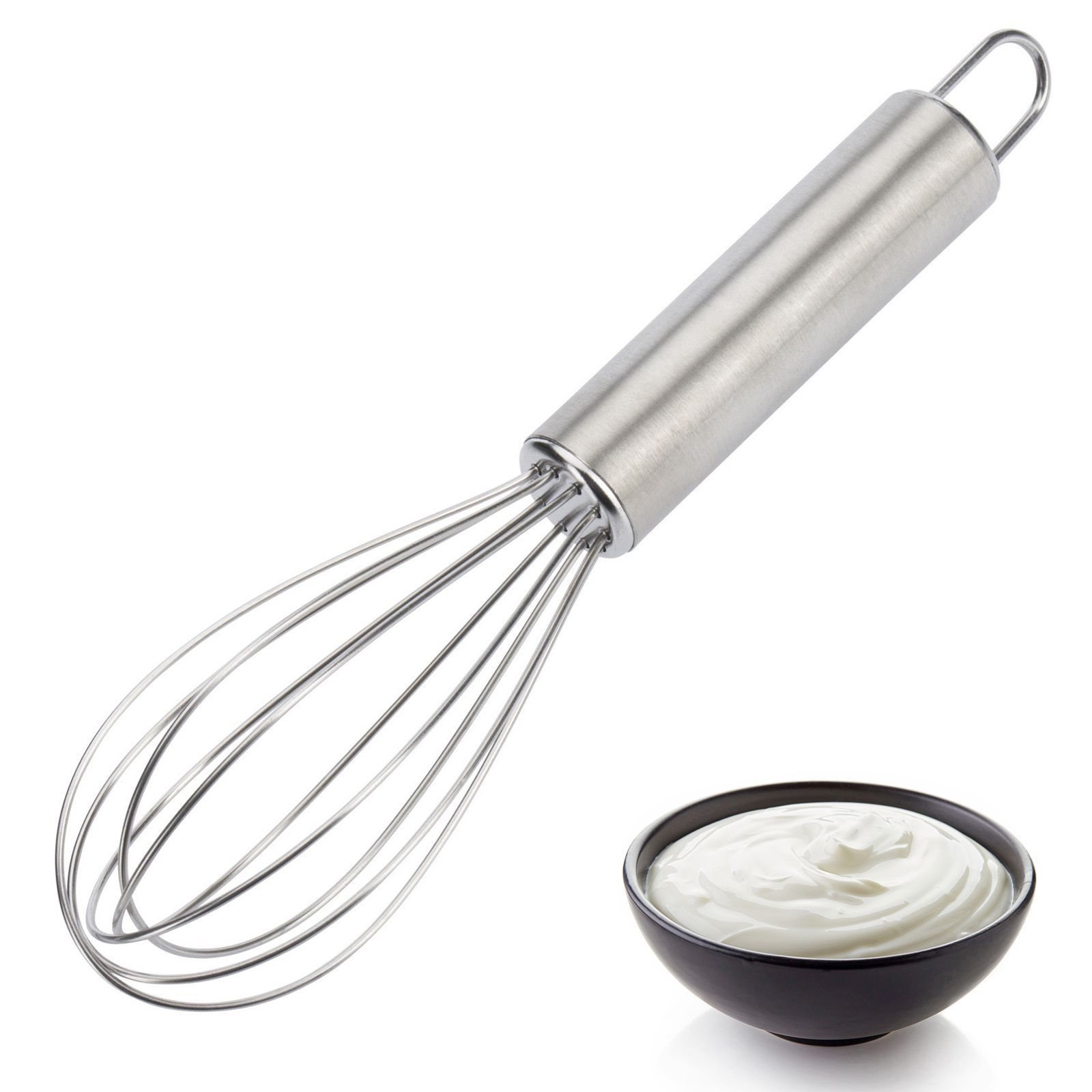 This quality whisk fits comfortably in hand thanks to its ergonomic-shaped handle. Eggs or creams, such as pastry dough, pudding, cream, or sauces, can be beaten quickly and easily.
