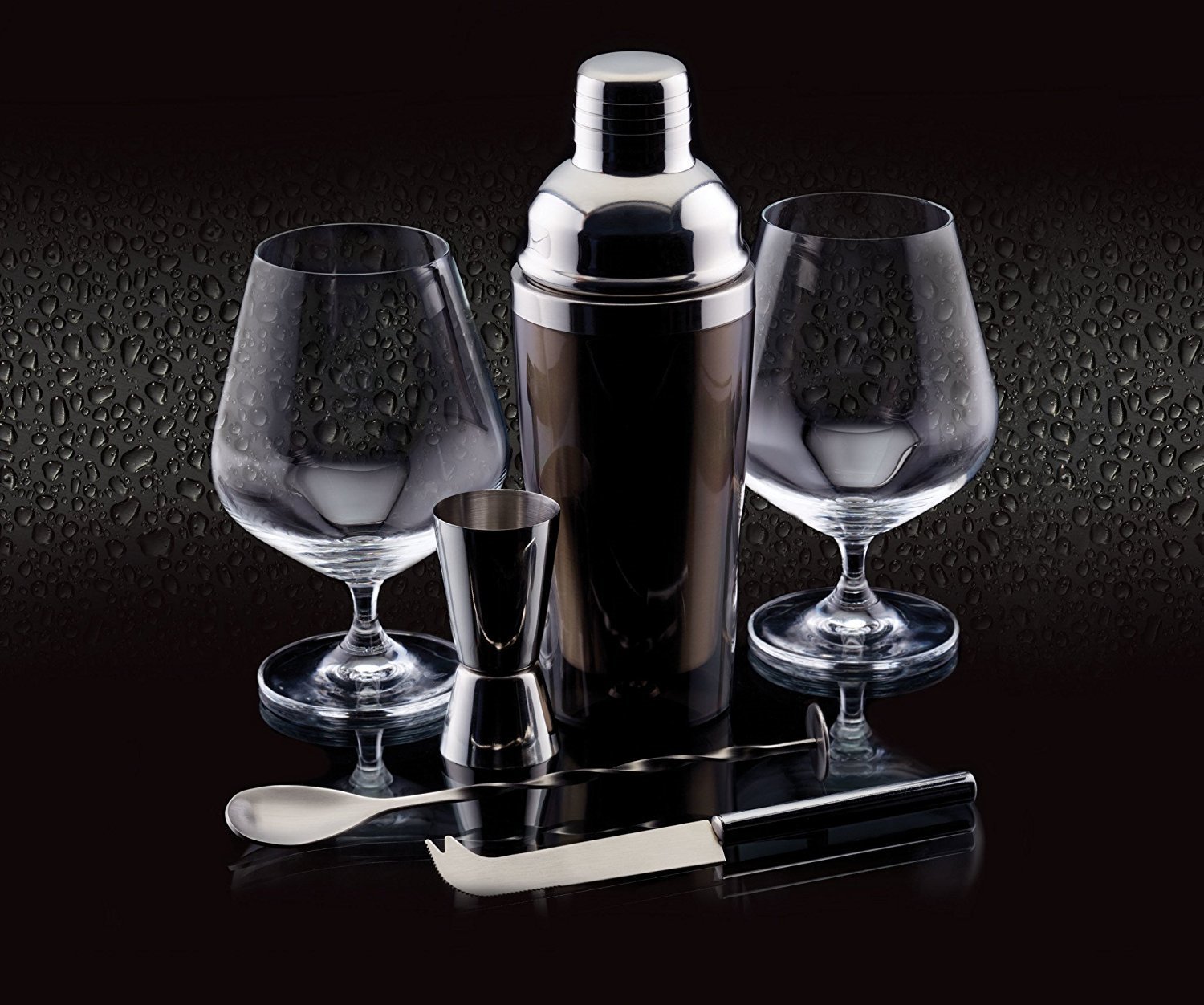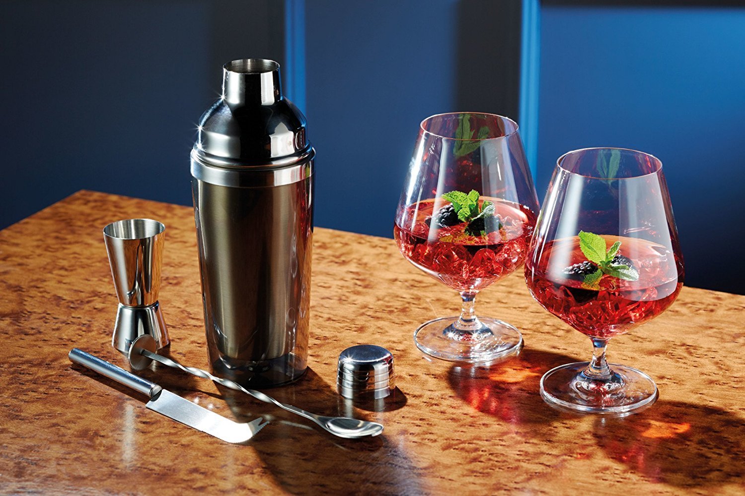 Setti sisältää ruostumattomasta teräksestä valmistetun ravistimen , jonka tilavuus on 400 ml, kaksinkertaisen ruostumattomasta teräksestä valmistetun mitta-astian, ruostumattomasta teräksestä valmistetun cocktaillusikan ja ruostumattomasta teräksestä valmistetun baariveitsen , cocktail-ohjevihkon ja kaksi dry gin -lasia , joiden tilavuus on 600 ml . jokainen.