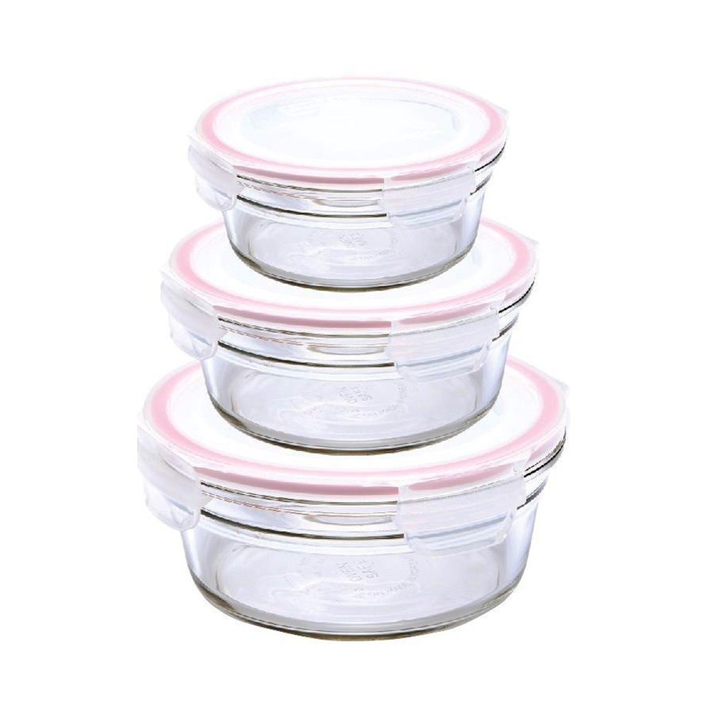 Kolmen pyöreän GlassLock, joka on valmistettu karkaistusta lasista, joka kestää -20 - + 120°C/230 °C lämpötiloja uunissa.