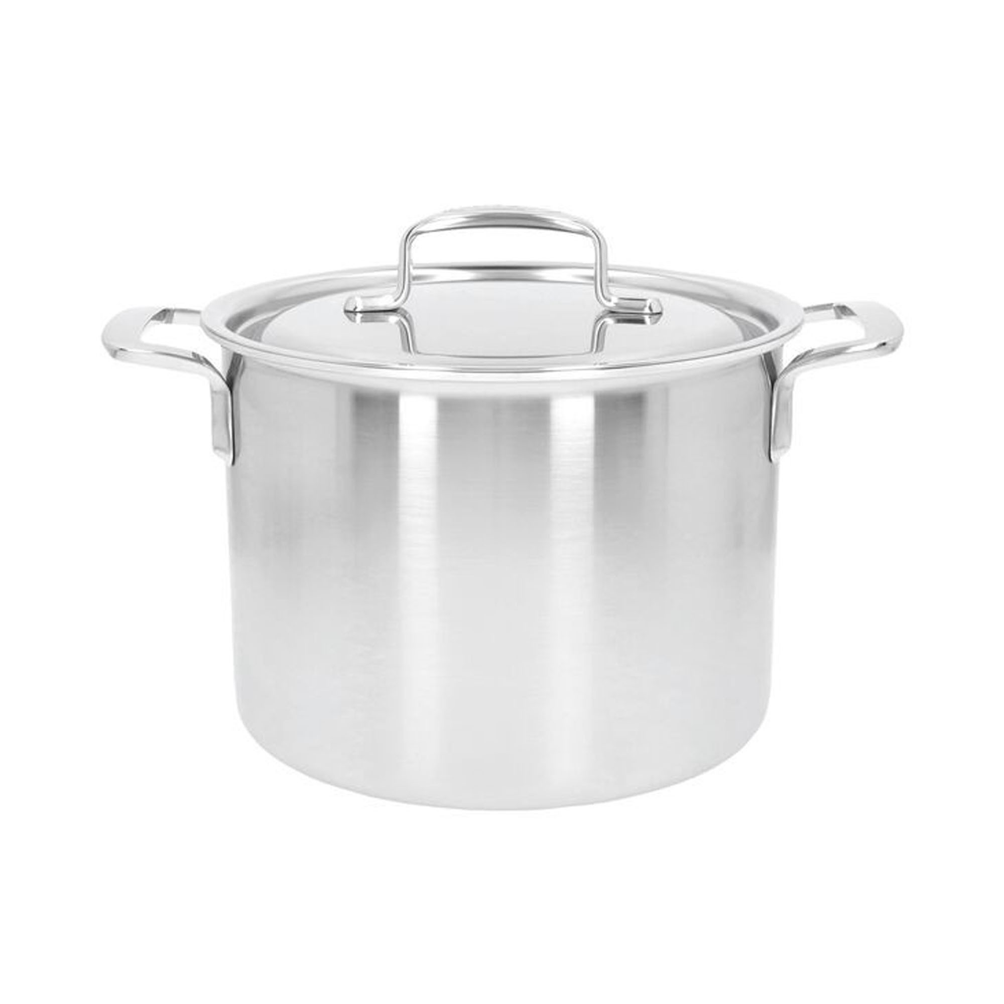 Marmite à couvercle, marque Demeyere, 20 cm de diamètre, en matériau 5 plis d’une épaisseur de 3 mm, capacité de 4 l, en acier inoxydable 18/10 avec un aspect mat et des poignées soudées en acier inoxydable.