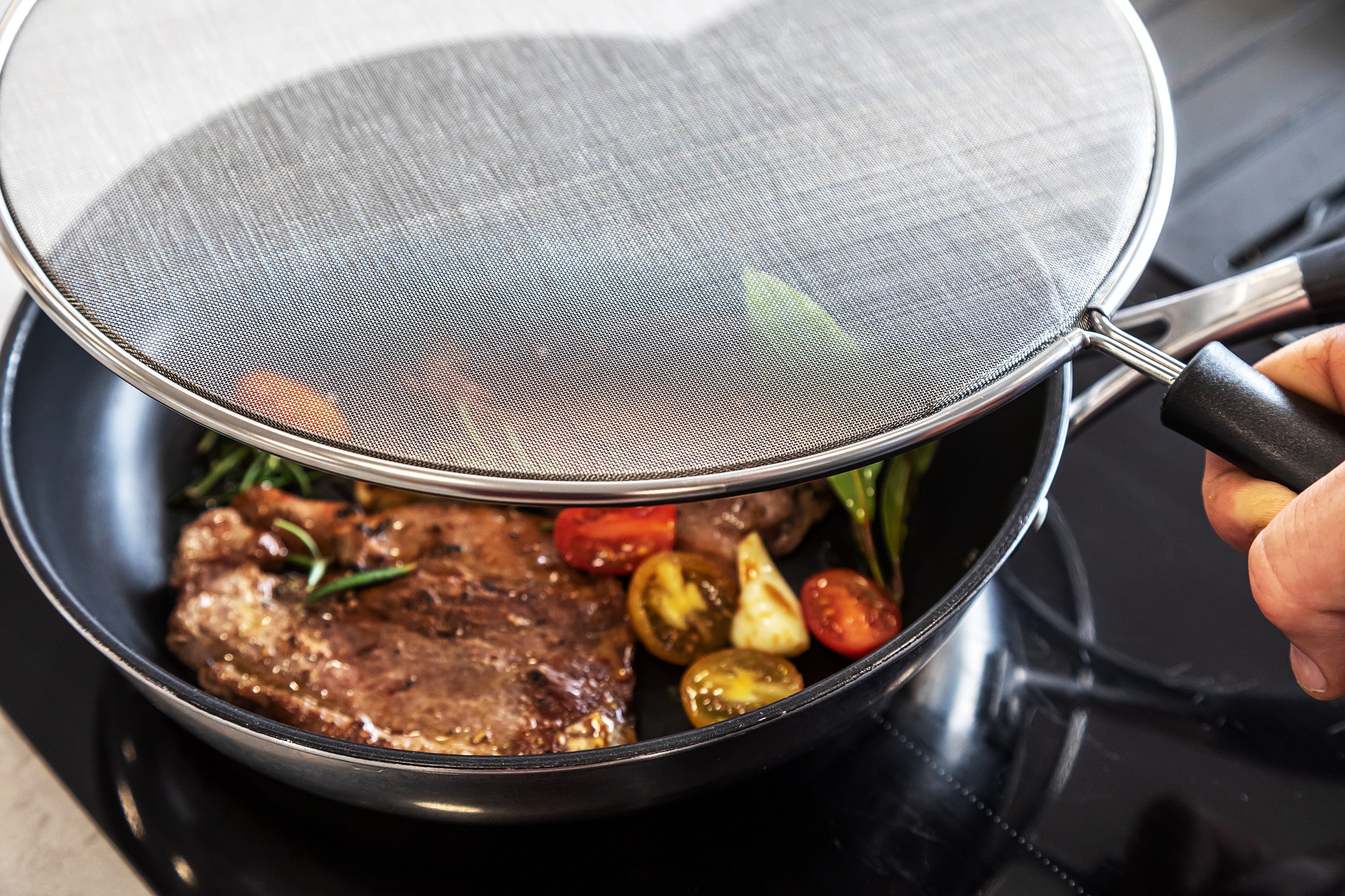 L’écran de protection contre les éclaboussures a une maille fine en acier inoxydable et une poignée en plastique confortable avec boucle d’accrochage pour stocker le produit.