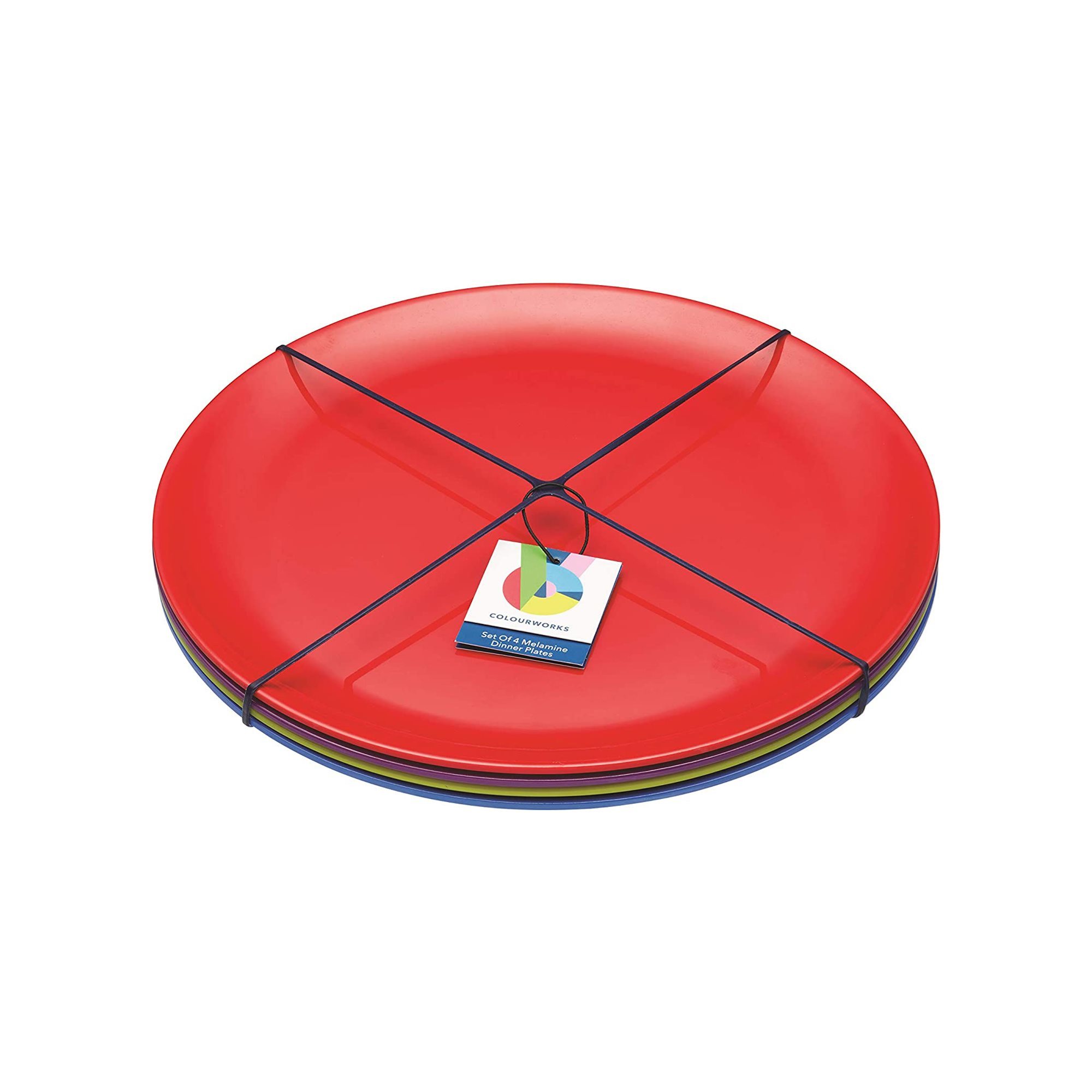 Ensemble de 4 assiettes, marque Kitchen Craft, en mélamine, diamètre 28 cm, dans les couleurs représentatives de la gamme Colourworks (vert, bleu, rouge et violet), étant le choix idéal pour le dîner. Les assiettes sont très résistantes, presque indestructibles, parfaites pour les pique-niques, les fêtes d’enfants et les repas en plein air.