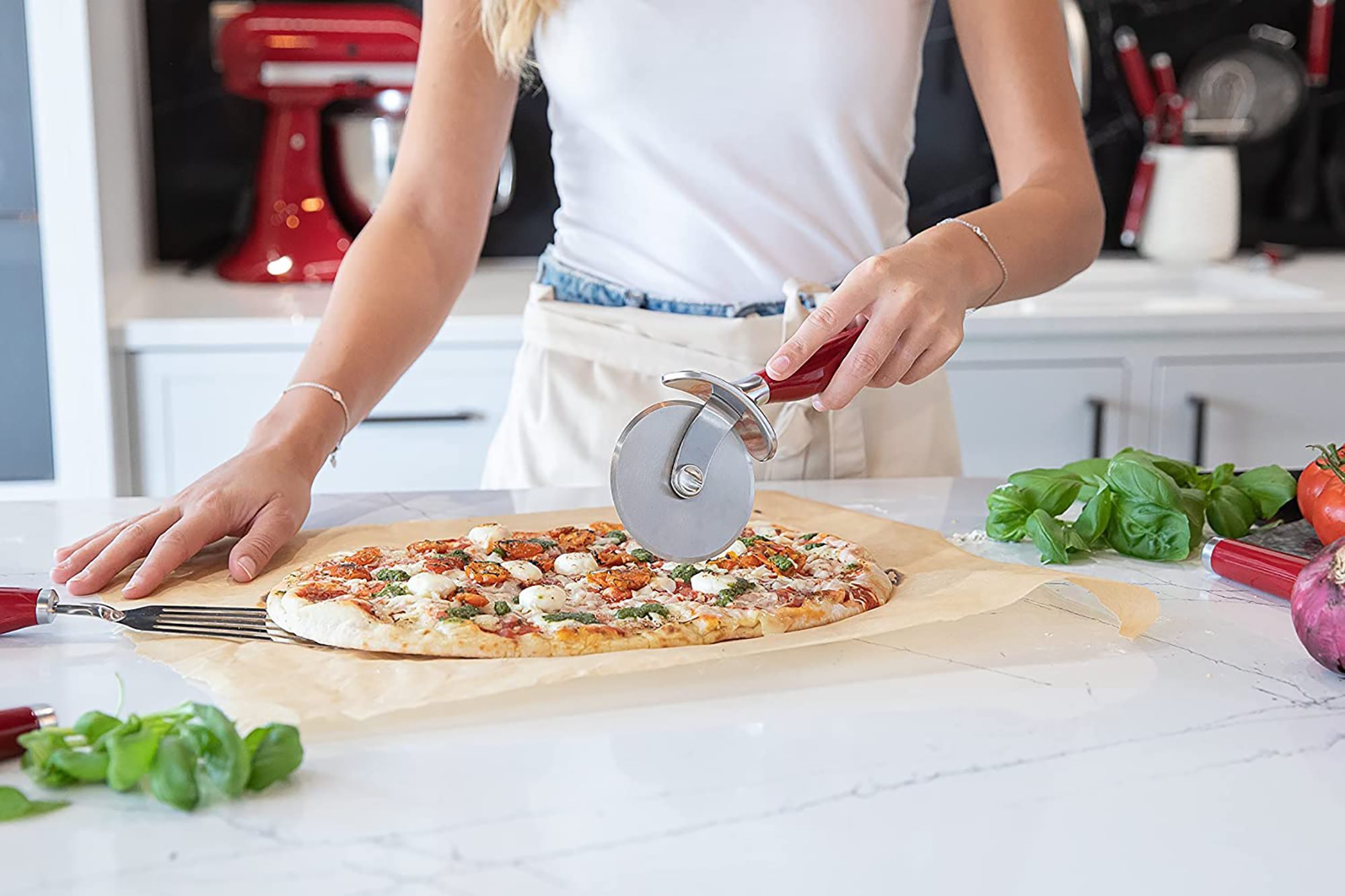 Affettatrice per pizza, KitchenAid marchio, realizzata in acciaio inossidabile 430, resistente alla ruggine, taglia la crosta della pizza in modo facile e veloce, mantenendo intatti i condimenti. Il design leggermente inclinato facilita il taglio e consente prestazioni ottimali ad ogni utilizzo.