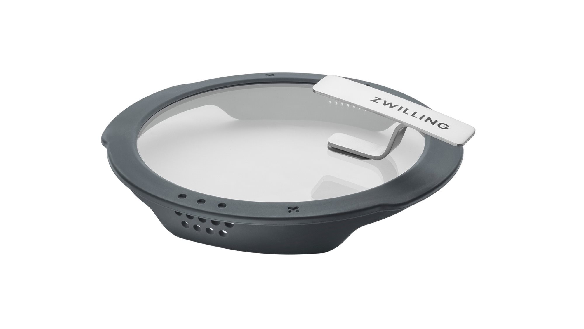 La X sul coperchio indica la posizione ottimale del coperchio per ridurre il rilascio di vapore. Grazie al supporto per coperchio integrato, il coperchio in vetro con funzione di versamento può essere fissato alla pentola durante la cottura e non deve essere rimosso.