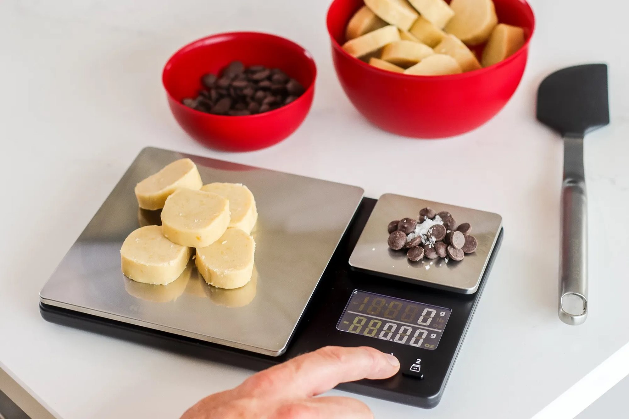 Bilancia elettronica, marchio KitchenAid , dotata di 2 piattaforme che pesano grandi quantità, fino a 5000 grammi con incrementi di 1 grammo e quantità inferiori a 500 grammi con incrementi di 0,01 grammi per ingredienti come lievito e spezie, garantendo precisione e controllo durante il processo di preparazione.