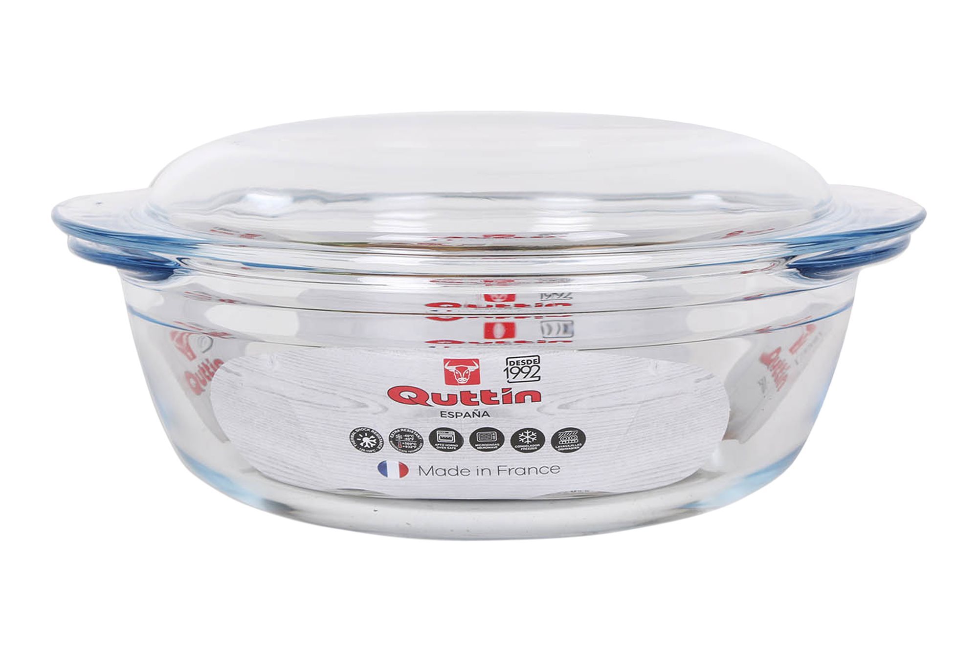 Ciotola rotonda con coperchio in vetro borosilicato resistente al calore, capacità 2,2 L, di manifattura di Quttin.