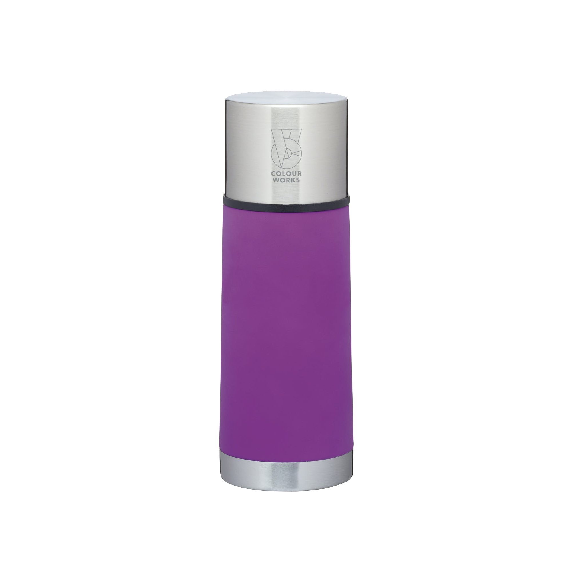 La bottiglia isolante Colourworks con rivestimento soft-touch è adatta per zuppe, caffè, tè e bevande fredde. Il flacone isolante ha base in acciaio inossidabile, coperchio ermetico che può essere utilizzato anche come tazza e meccanismo di apertura per un versamento controllato.