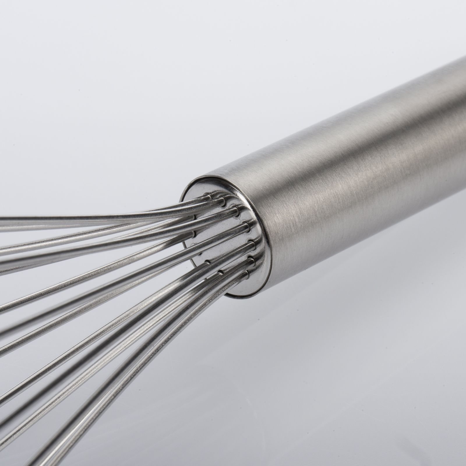 Questa frusta di qualità si adatta comodamente alla mano grazie al suo manico dalla forma ergonomica. Uova o creme, come pasta frolla, budino, panna o salse, possono essere battute rapidamente e facilmente.