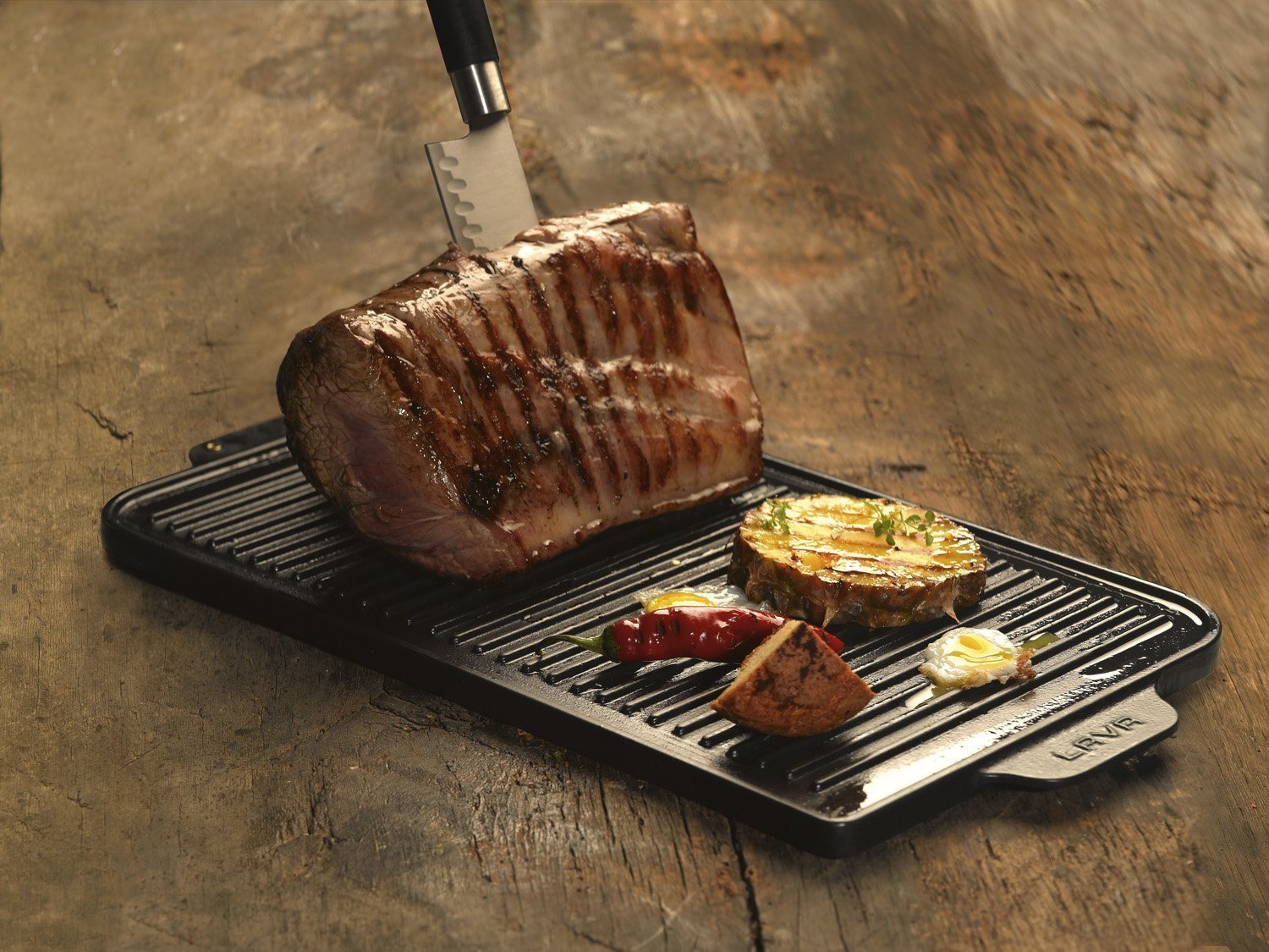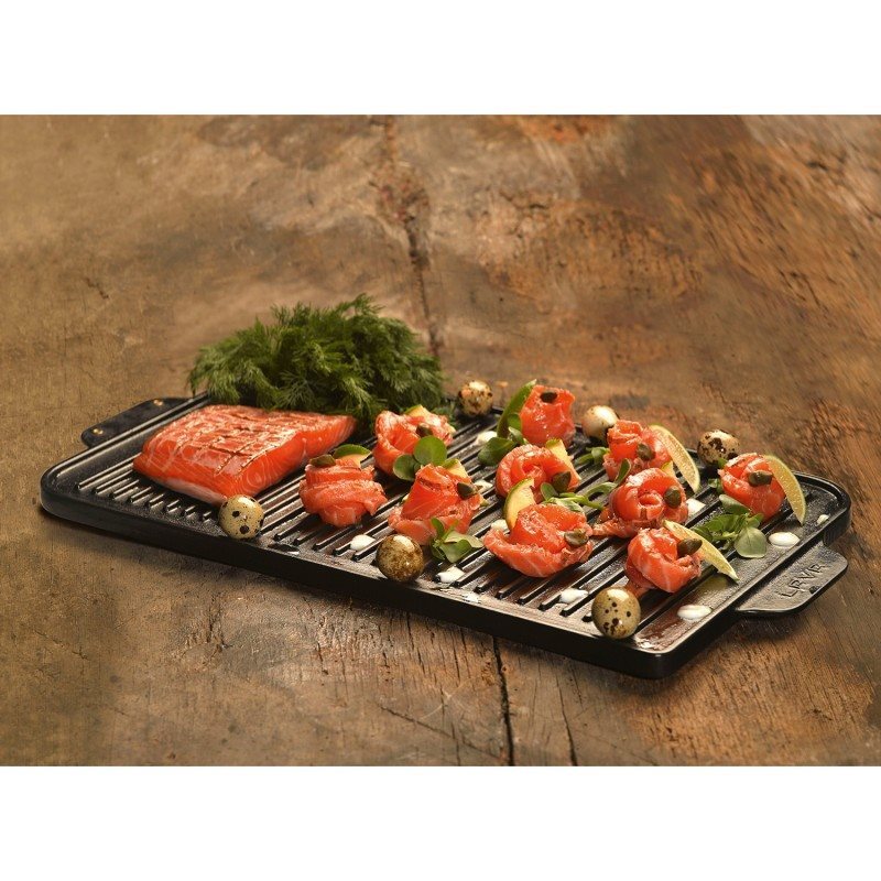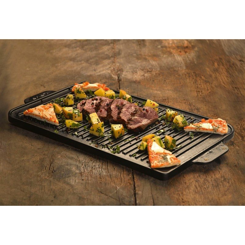 Piano cottura grill reversibile prodotto da Lava, dimensioni 44×26 cm, realizzato in ghisa con spessore 5 mm. Da un lato del prodotto è presente una superficie grigliata e dall'altro una superficie piana.