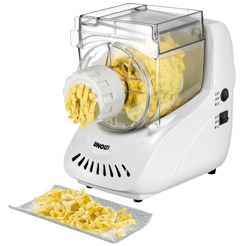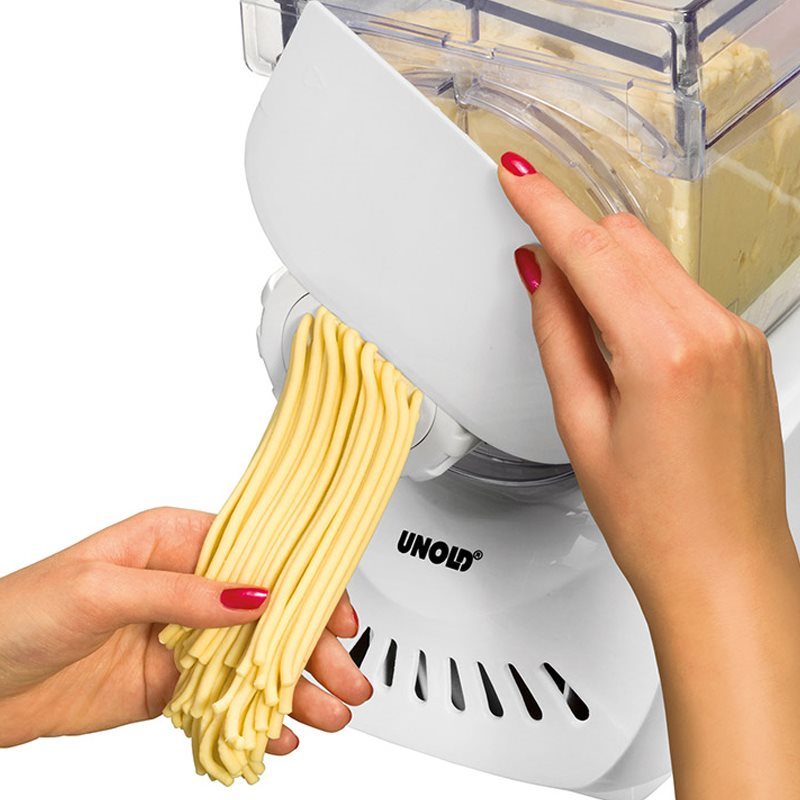 Questa macchina per pasta UNOLD include dischi per preparare biscotti e pasta (pappardelle, linguine, fettuccine, spaghetti, tagliatelle), oltre a un accessorio per farcire salsicce o rigatoni.