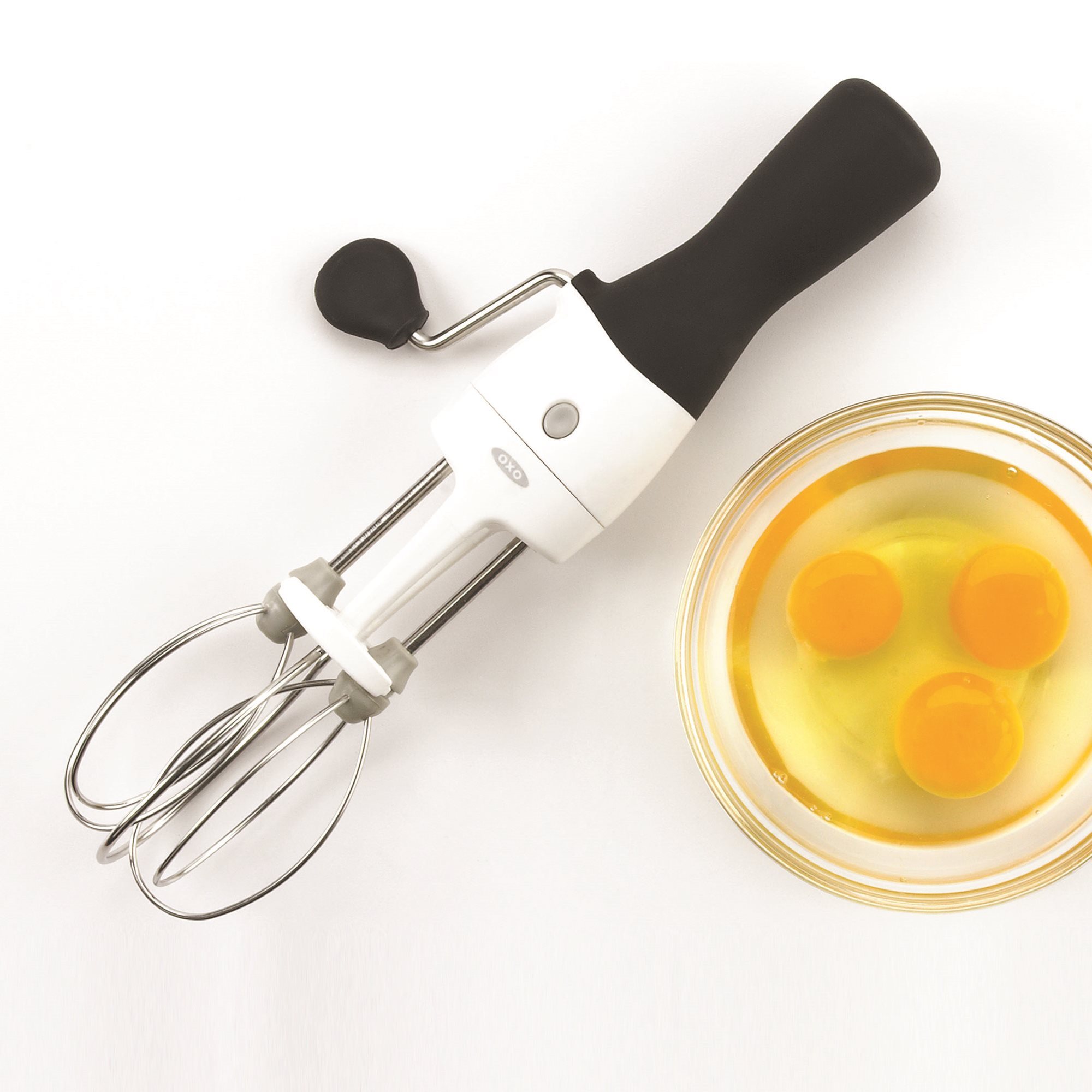 Miscelatore a manovella manuale, marchio OXO, con fruste in acciaio inox.