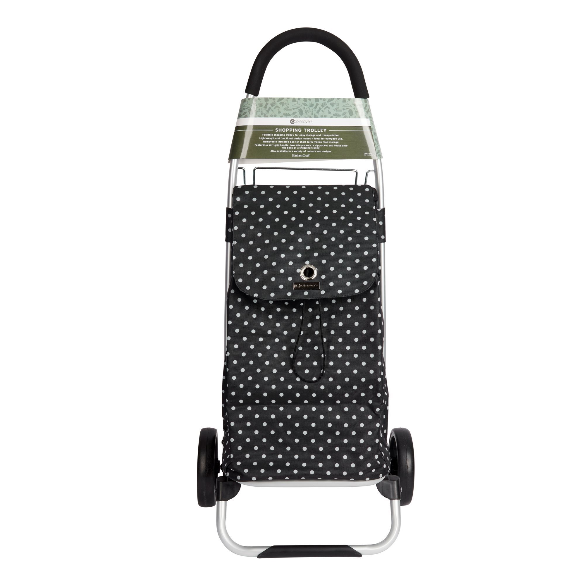 La borsa trolley per la spesa di Kitchen Craft dispone di un ampio scomparto portaoggetti con chiusura a coulisse e di uno scomparto individuale con cerniera per tenere al sicuro chiavi e portafoglio. Inoltre, include una borsa termica separata per portare a casa in sicurezza il cibo congelato.