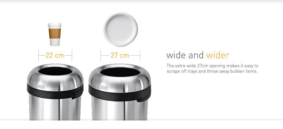 Il cestino non è dotato di coperchio, ma di un'apertura larga 27 cm per poter gettare nel minor tempo possibile i rifiuti ingombranti o gli avanzi dei vassoi utilizzati nei ristoranti o in altri locali. Ciò rende il cestino ideale per spazi commerciali come ristoranti o bar.