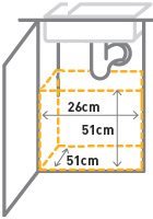 Assicurati di avere lo spazio necessario per il corretto funzionamento del cestino. Hai bisogno di uno spazio alto 51 cm , lungo 51 cm e largo 26 cm . Inoltre, assicurati di prendere in considerazione tubi o altri oggetti che potrebbero ostruire l'area destinata al bidone della spazzatura.