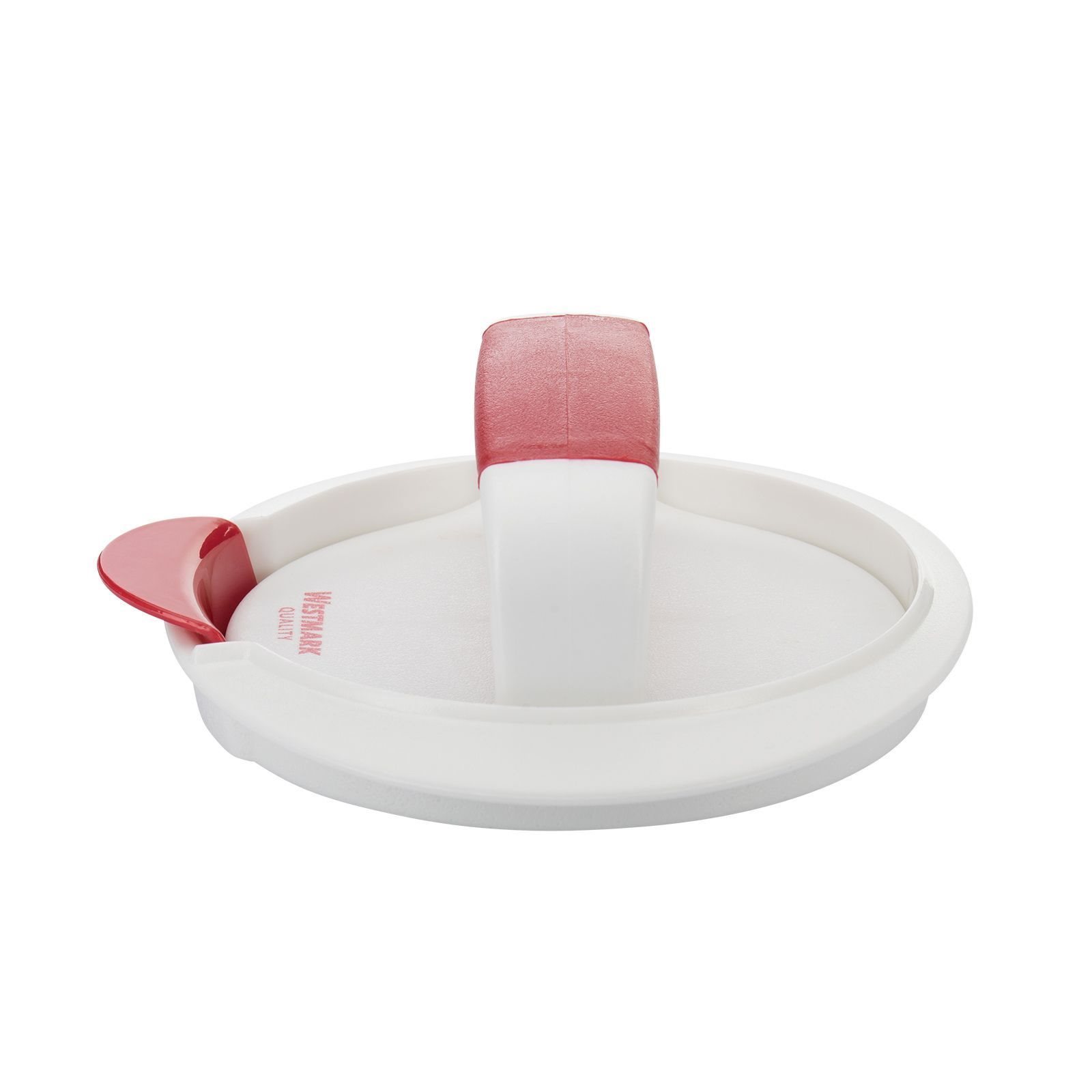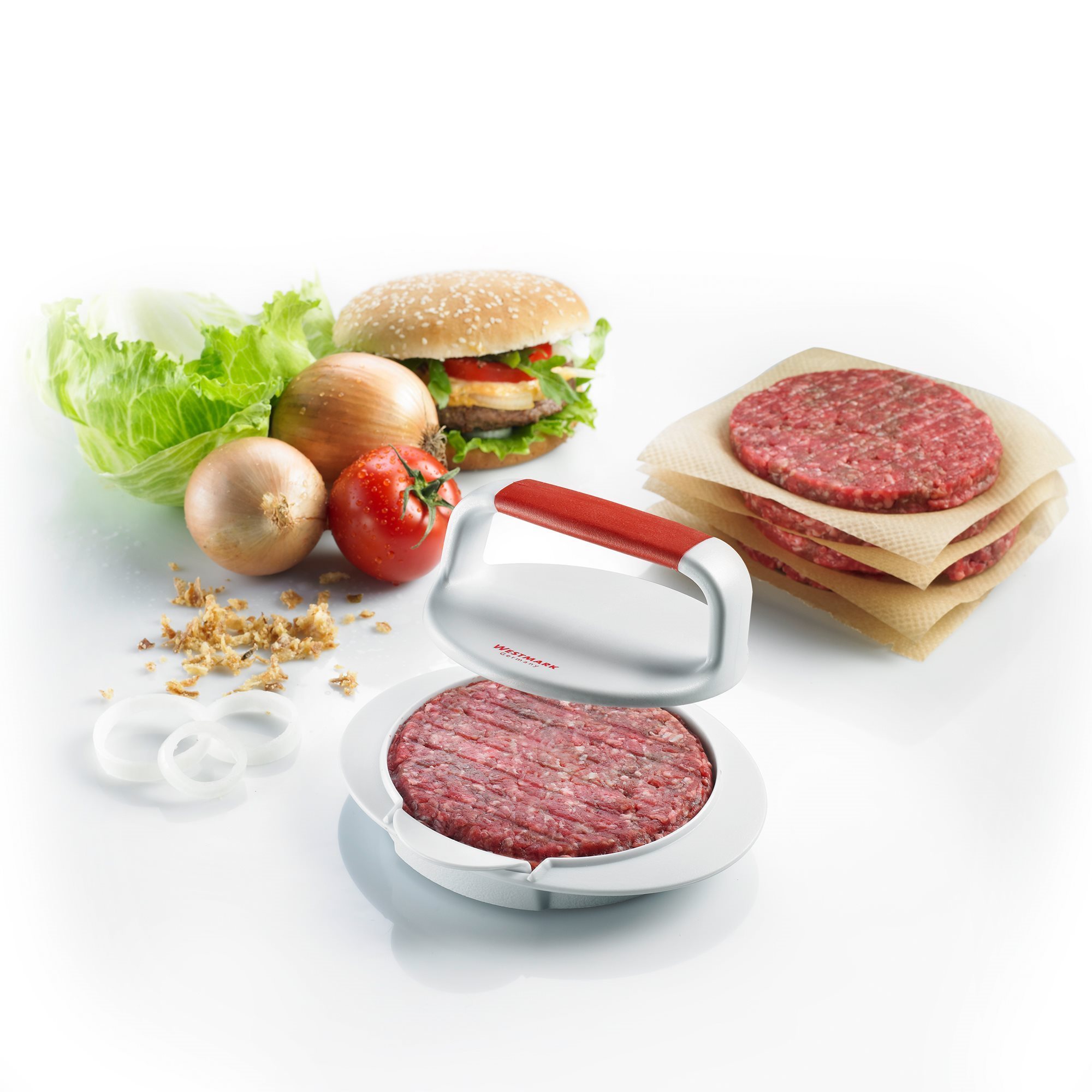 Pressa per la preparazione di hamburger, marchio Westmark, realizzata in plastica, dimensioni 16 x 14,8 x 5,7 cm.
