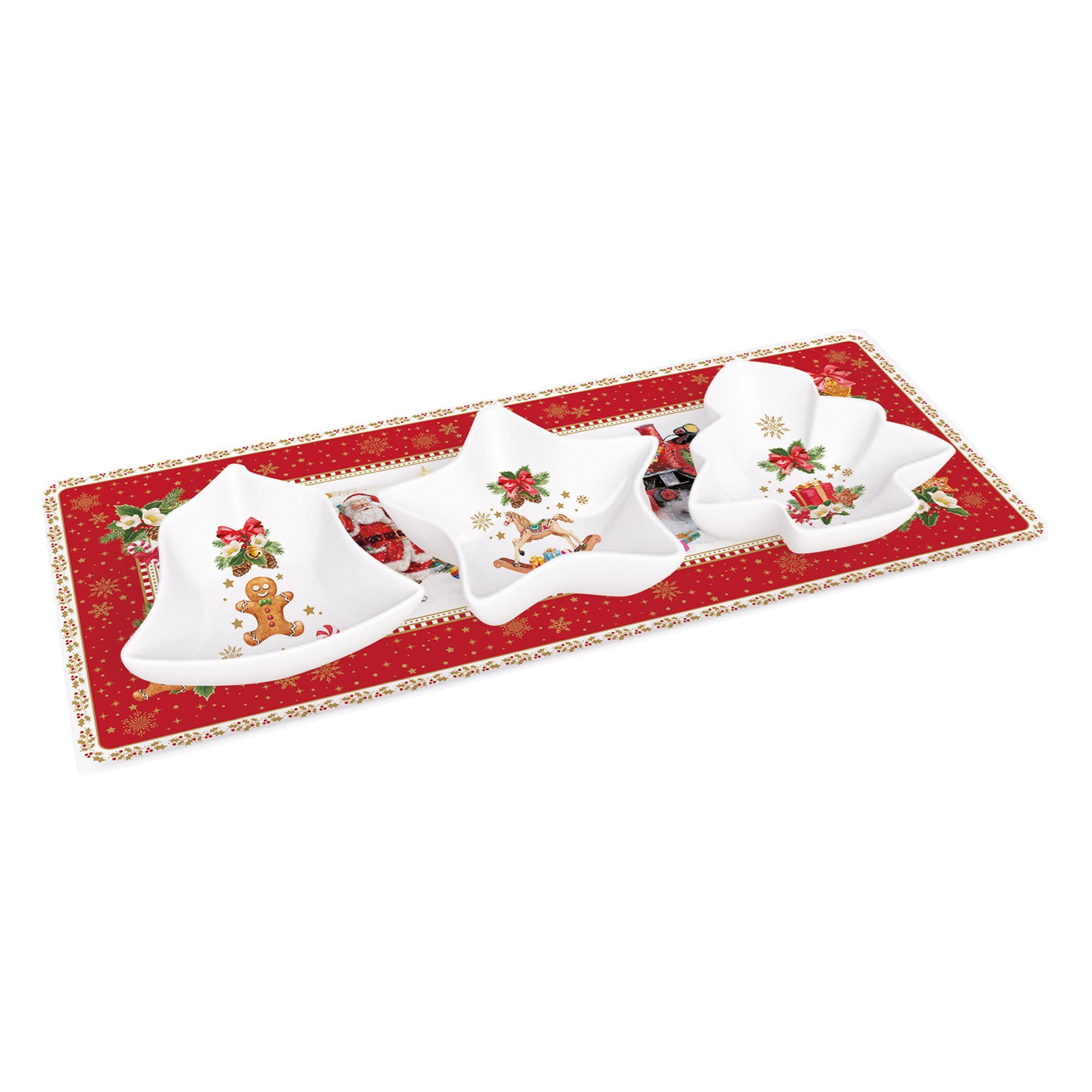 Le 3 ciotole a forma di stella, campana e albero di Natale completano perfettamente questo set, essendo adatte per servire olive o salse per arrosti.