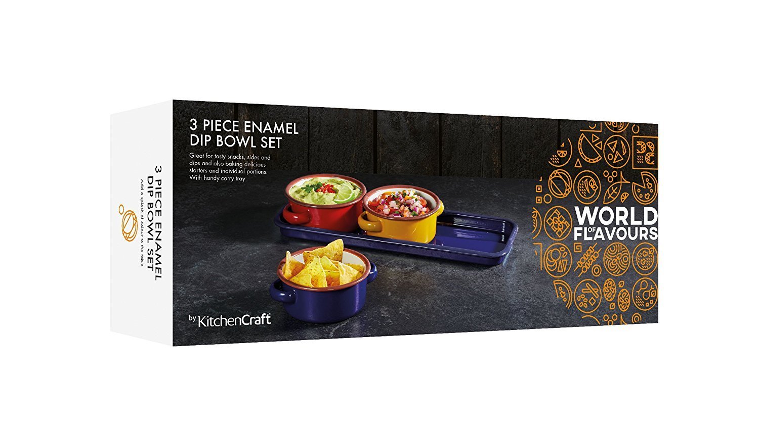 Set per servire salse, della gamma "World of Flavours", prodotta da Kitchen Craft. Il set contiene 3 mini-ciotole per la salsa e un vassoio da portata.