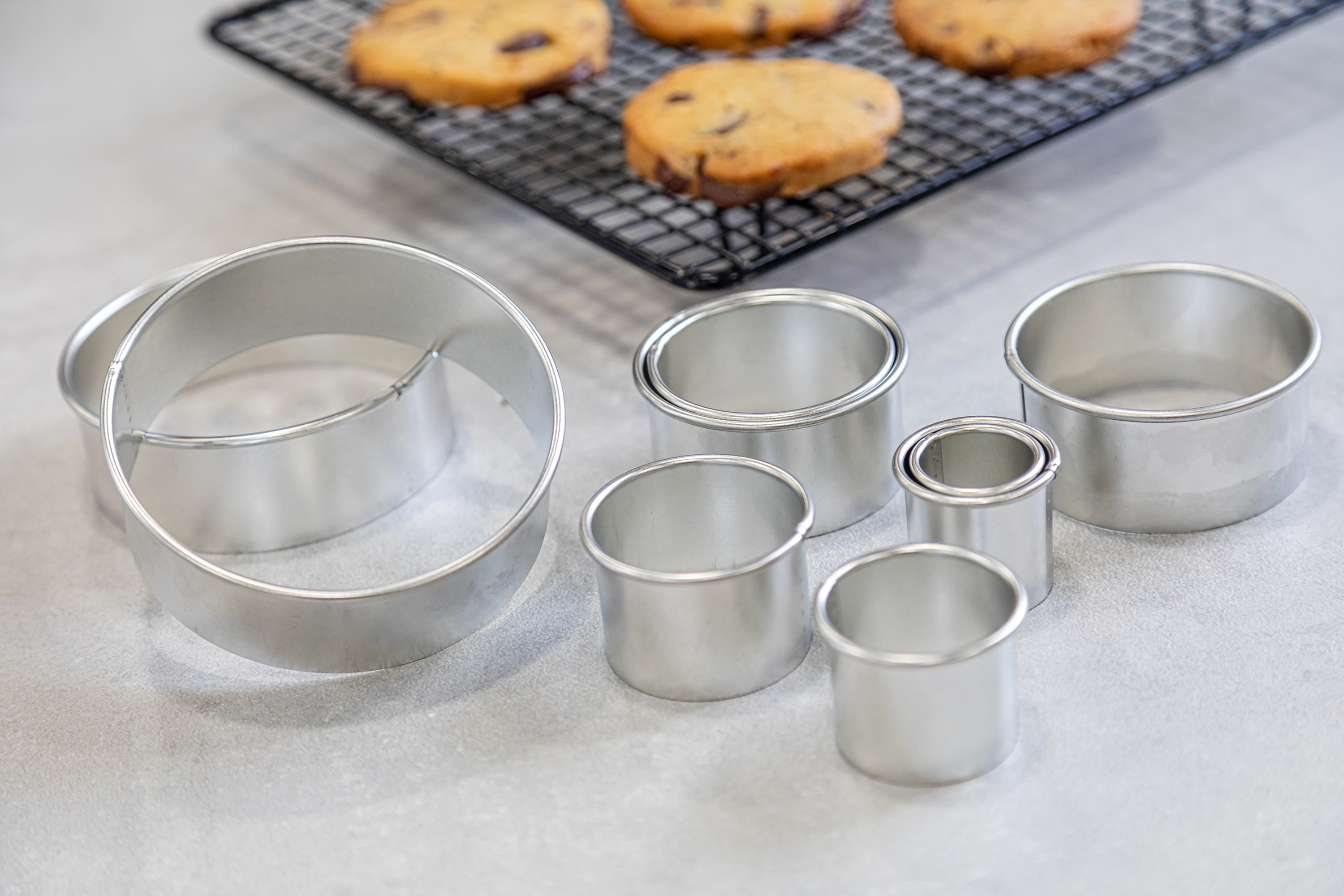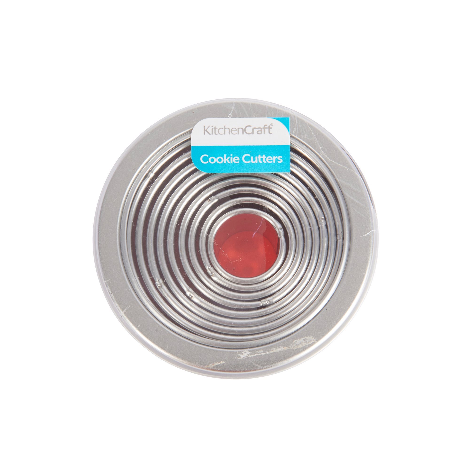 Set di 11 forme per il taglio dell'impasto per pasticceria, del marchio Kitchen Craft, tutte in metallo,con diametri compresi tra 10 cm (il più grande) e 2,5 cm (il più piccolo).