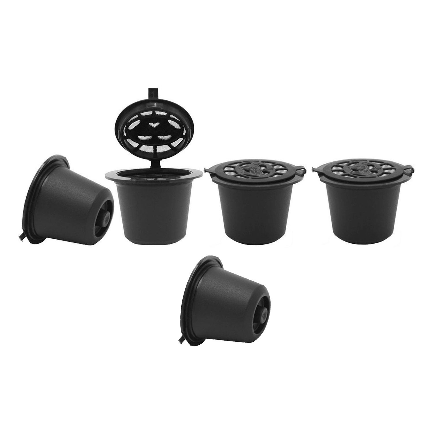 Set di 5 capsule di caffè riutilizzabili, adatte a qualsiasi tipo di caffè macinato, prodotte da Quttin. La confezione include un misurino e una spazzola per la pulizia.