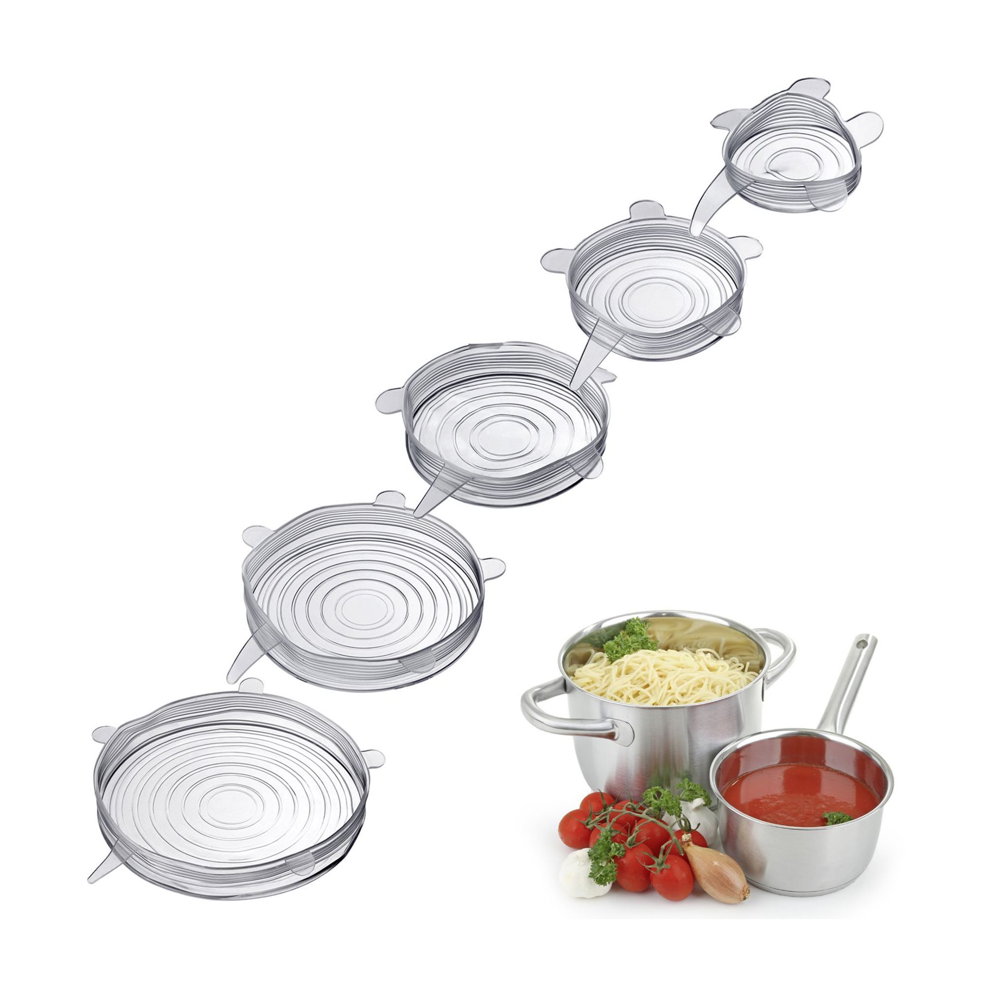 I coperchi sono riutilizzabili e hanno i seguenti diametri: 6,5 cm, 9,5 cm, 14,5 cm, 16,5 cm e 20,5 cm. Questi coperchi possono essere utilizzati con contenitori che hanno dimensioni comprese tra 8 e 27 cm. Essendo flessibili, si modellano facilmente e sono un'alternativa duratura al foglio alimentare.