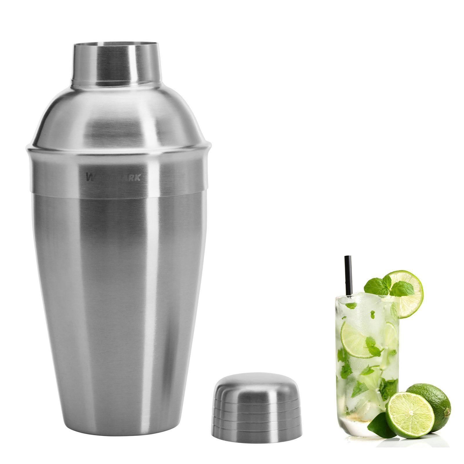 Shaker in acciaio inossidabile, prodotto da Westmark, dimensioni 205 x Ø 90 mm, capacità 0,5 litri, con coperchio rimovibile e setaccio per trattenere pezzi di frutta o cubetti di ghiaccio.