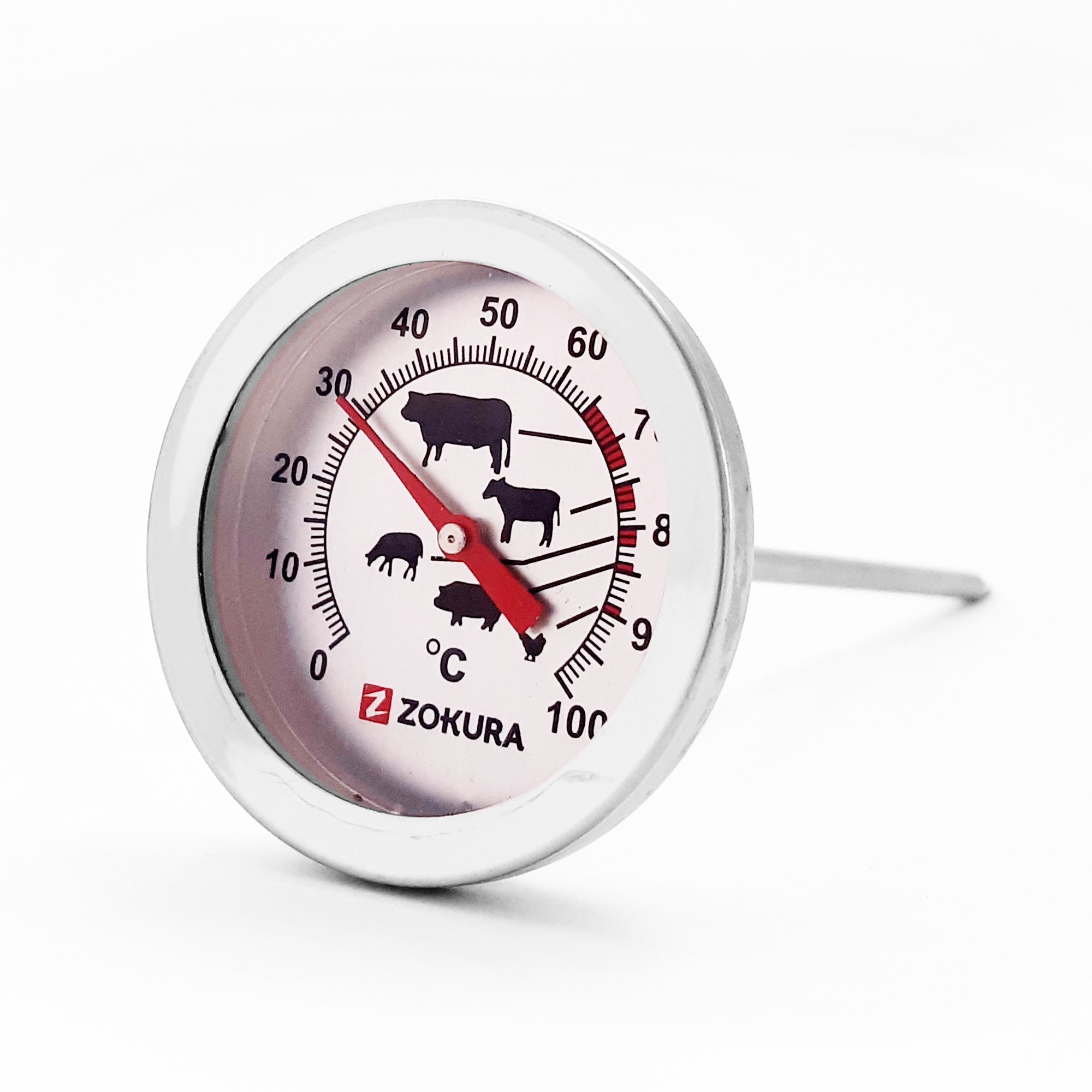 Termometro per bistecca - marca Zokura - realizzato in acciaio inossidabile, lunghezza della sonda di misurazione 12,5 cm. Il termometro misura temperature comprese tra 0 e 100°C.
