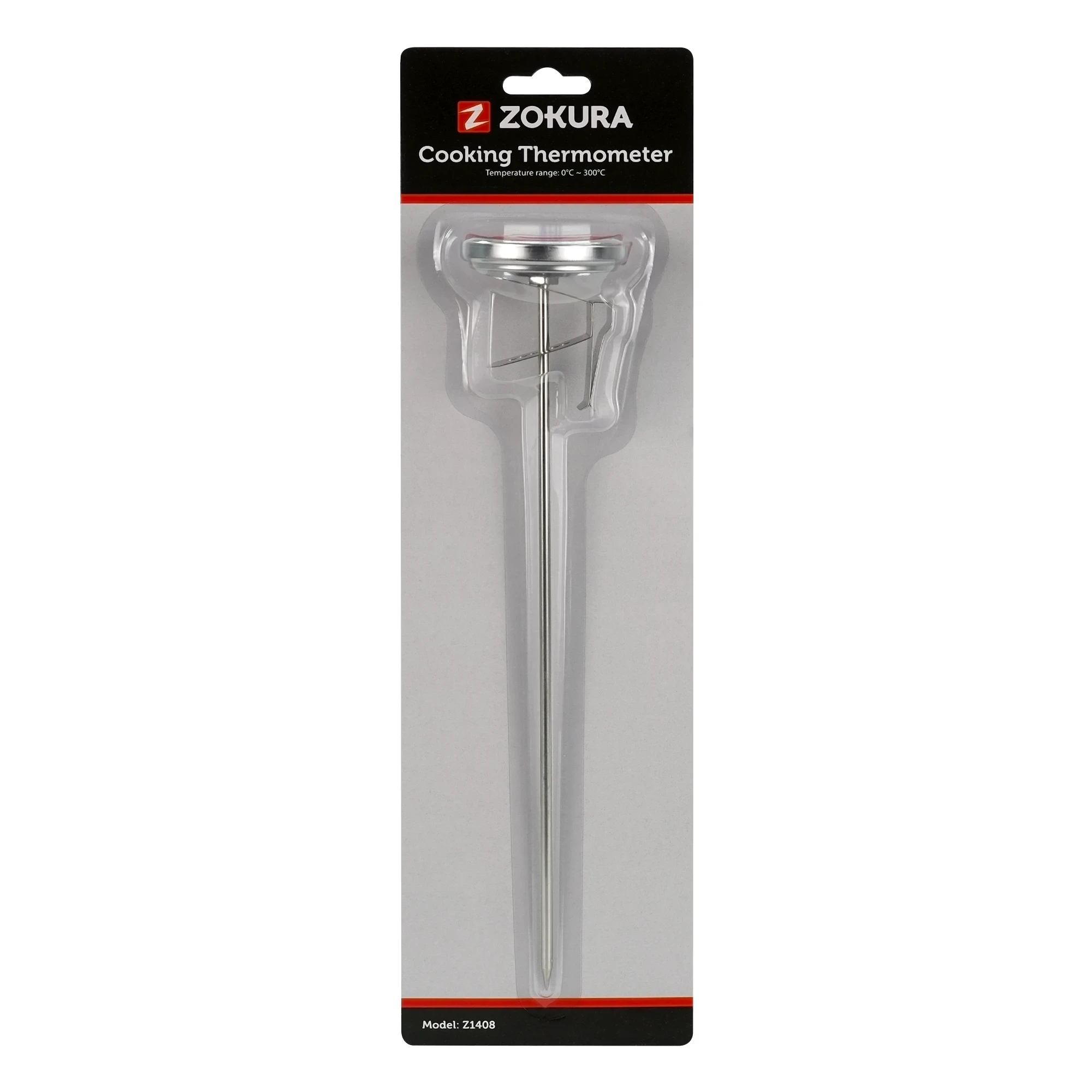 Termometro universale, marca Zokura , realizzato in acciaio inossidabile, con quadrante da 5,4 cm e lunghezza dell'asta di 25 cm (diametro dell'asta 3,8 mm), che misura temperature comprese tra 0°C e 300°C.