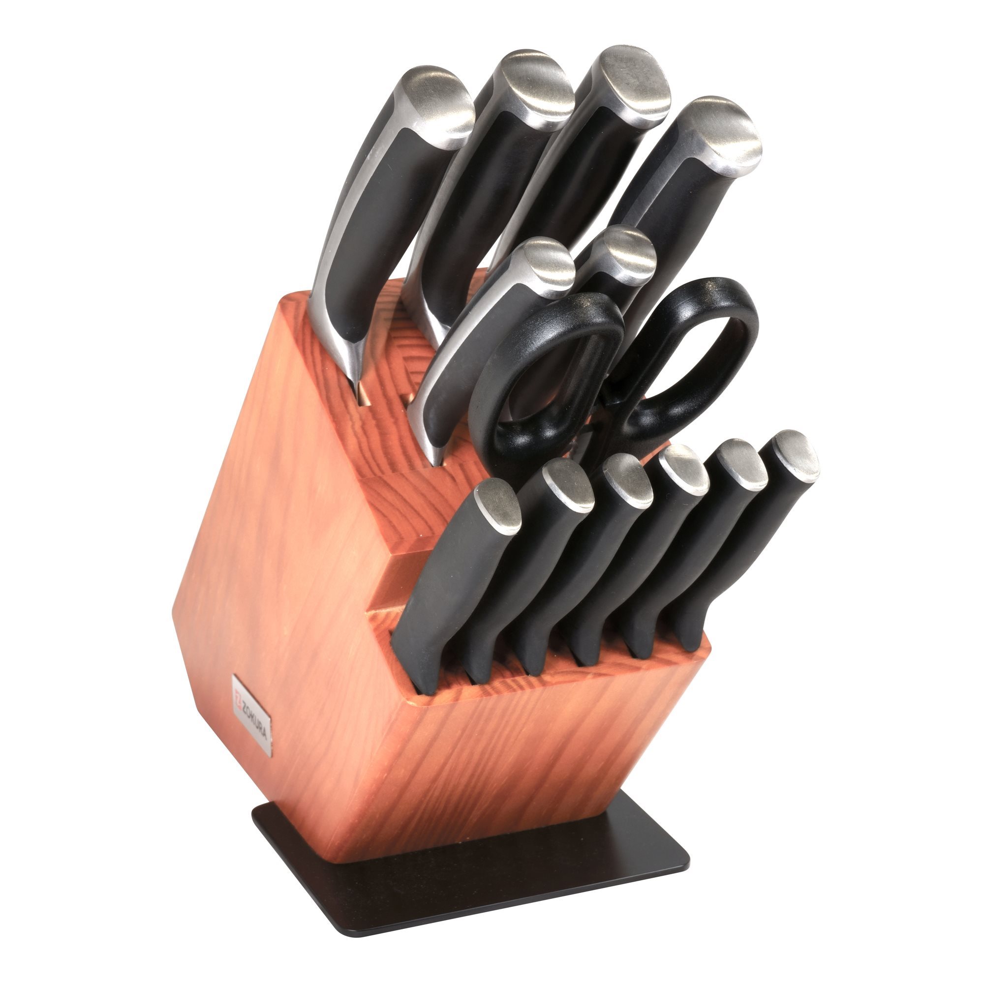 De messen worden geleverd met een aantrekkelijke grenen houten houder, die is voorzien van voeten, voor een goede stabiliteit.