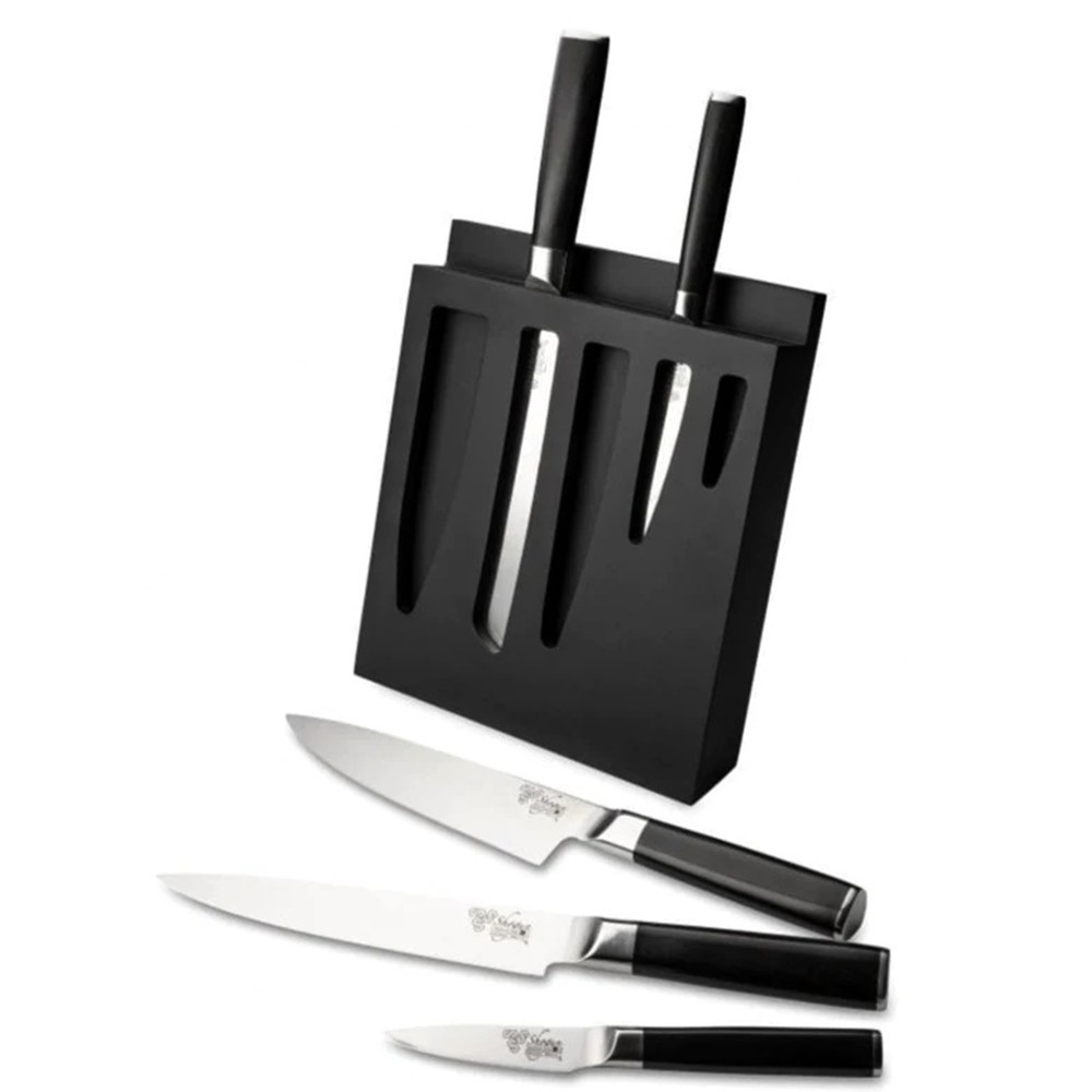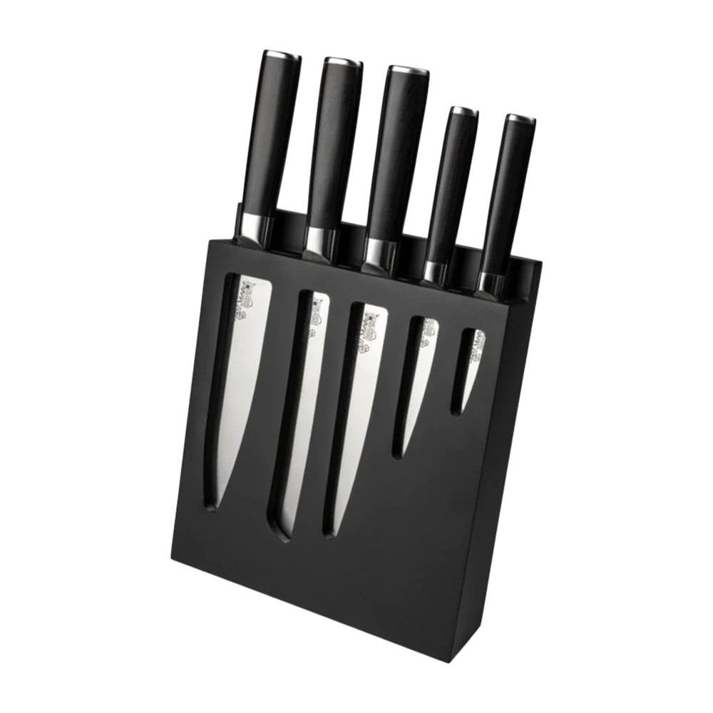De exclusieve set uit de Shogun collectie bevat een luxe zwart houten messenblok met kijkgleuven, zodat je voor verschillende keukentaken het juiste mes kiest.
